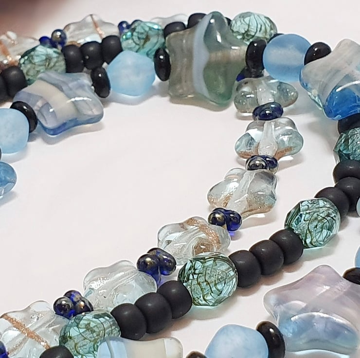 There are chunky little star beads which are a pale blue/grey colour and frosted blue bicone beads, separated by small black saucer beads on one strand.