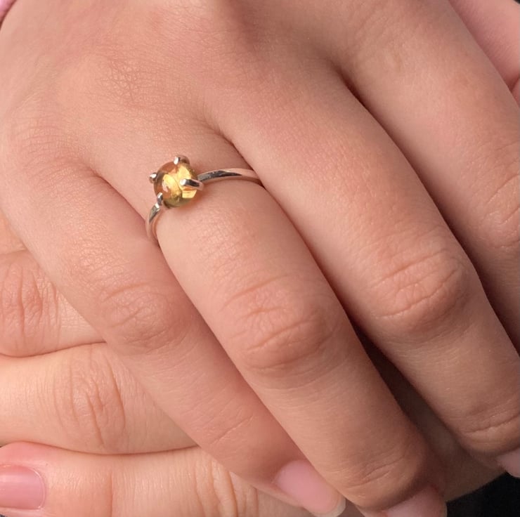 This handcrafted ring showcases a beautiful, authentic citrine gemstone set in four prongs a top a hammered, polished band. Created with 1.2mm sterling silver round wire, it's offered in a range of sizes and displayed here in a J.