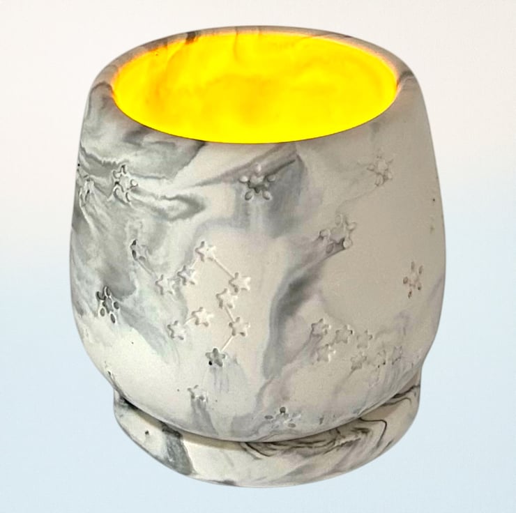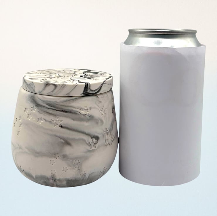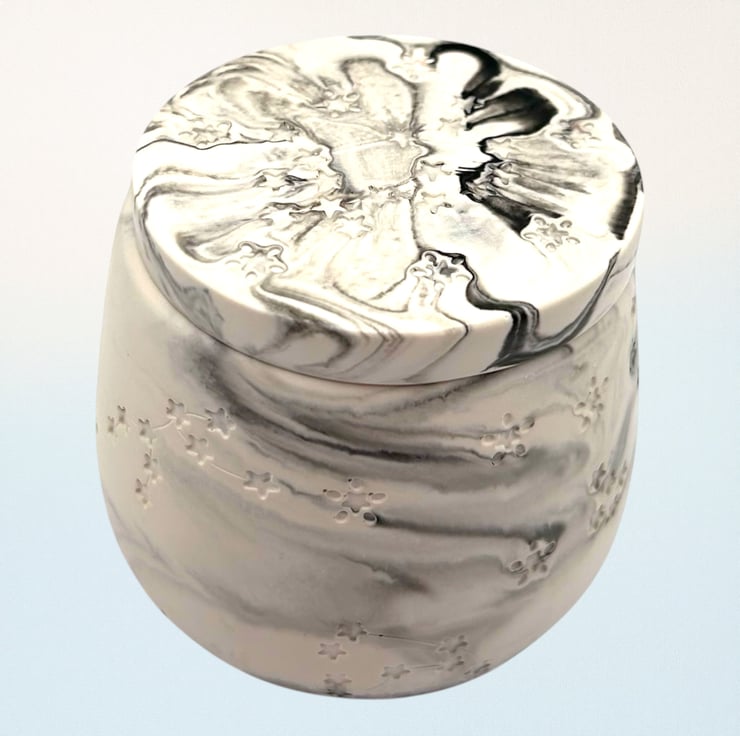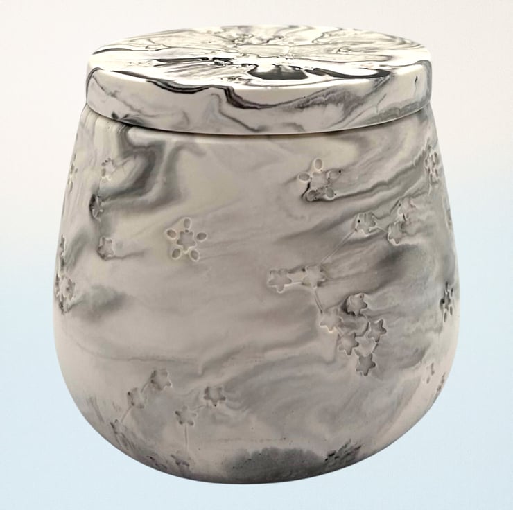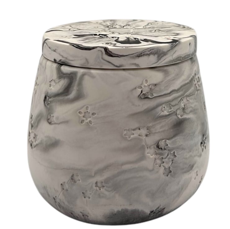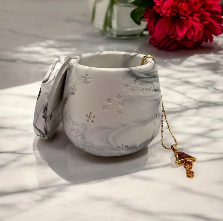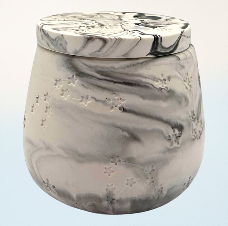 This handmade white trinket pot features stunning black and grey marbling and is adorned with stars and constellations on both the lid and exterior. It is crafted from Crystacast, which provides a dense, smooth, and luxurious finish that resembles marble, and also gives it a pleasingly weighty feel. This pot is perfect for storing your keepsakes, trinkets, jewellery, or small treasures. Additionally, it can serve as a candle jar for tealights or small pillar candles, with the lid conveniently repurposed as a coaster to protect your surfaces from heat.