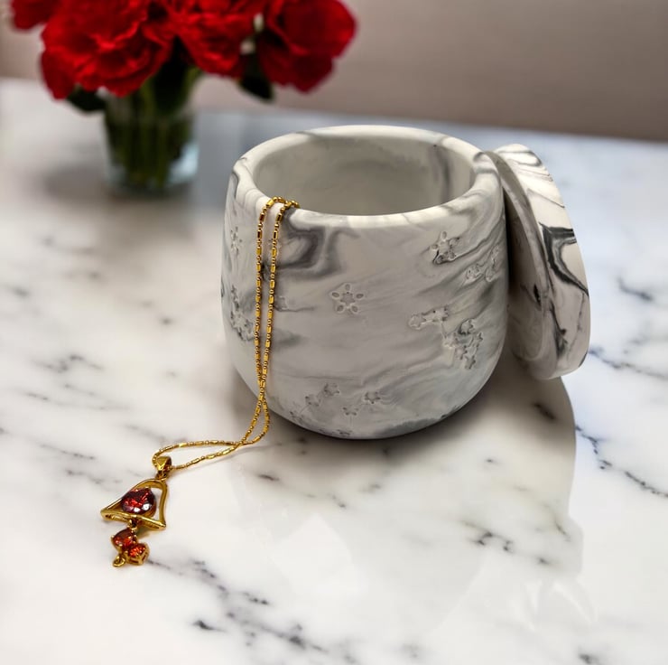 The beautiful marbling effect on this trinket box ensures that each piece is a unique work of art. The neutral colour scheme allows it to seamlessly complement various interior décor styles, making it an ideal gift for someone special or a delightful treat for yourself.