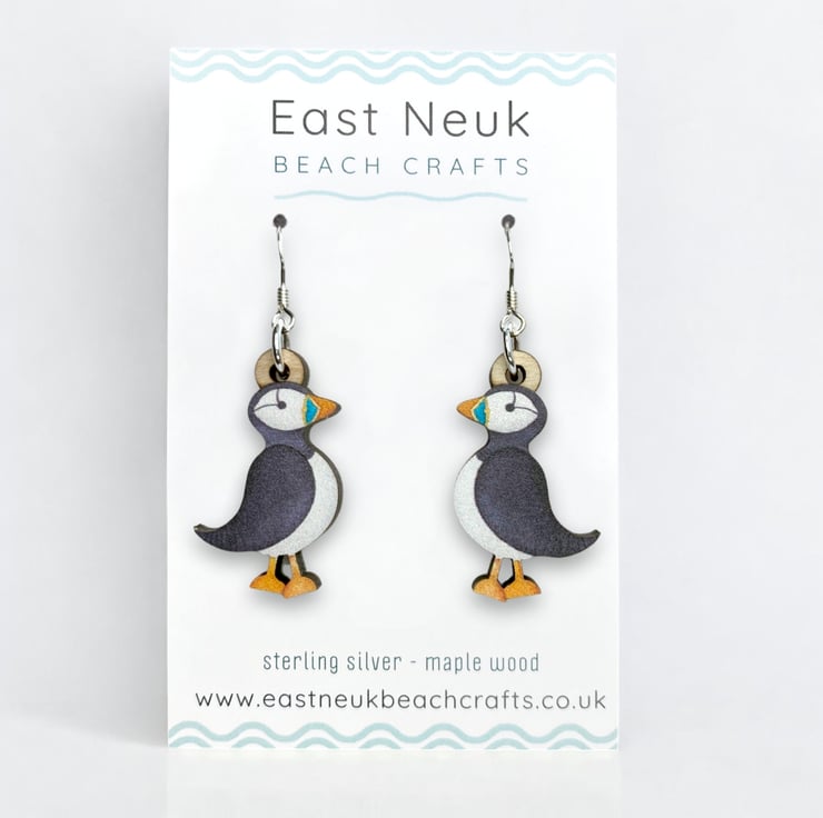 A cute pair of dangly earrings featuring tiny puffins. Crafted from beautiful maple wood, the intricate puffin design is printed in vibrant detail, taken from an original watercolour painting.