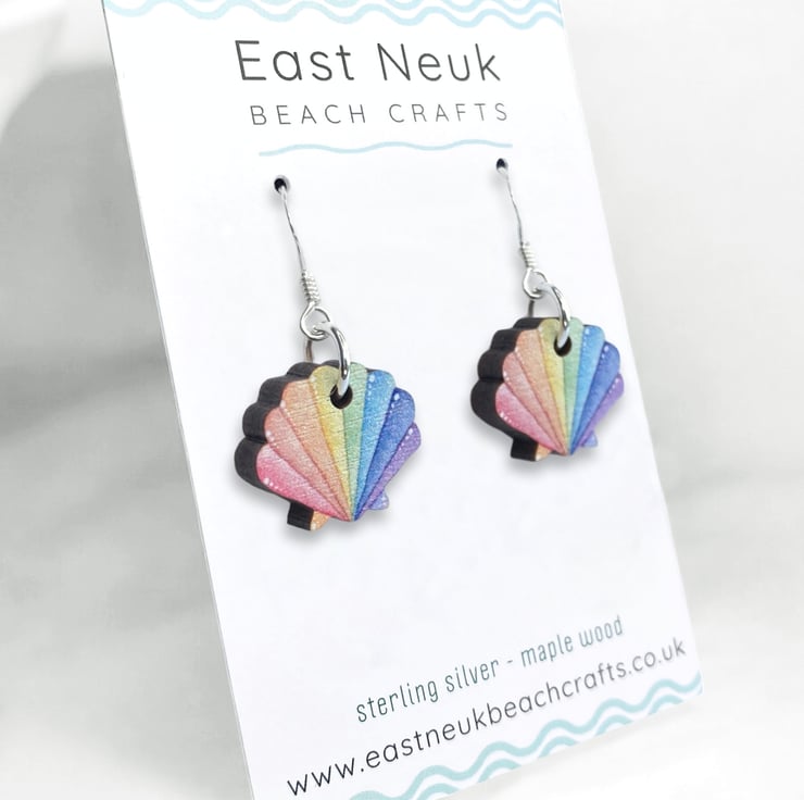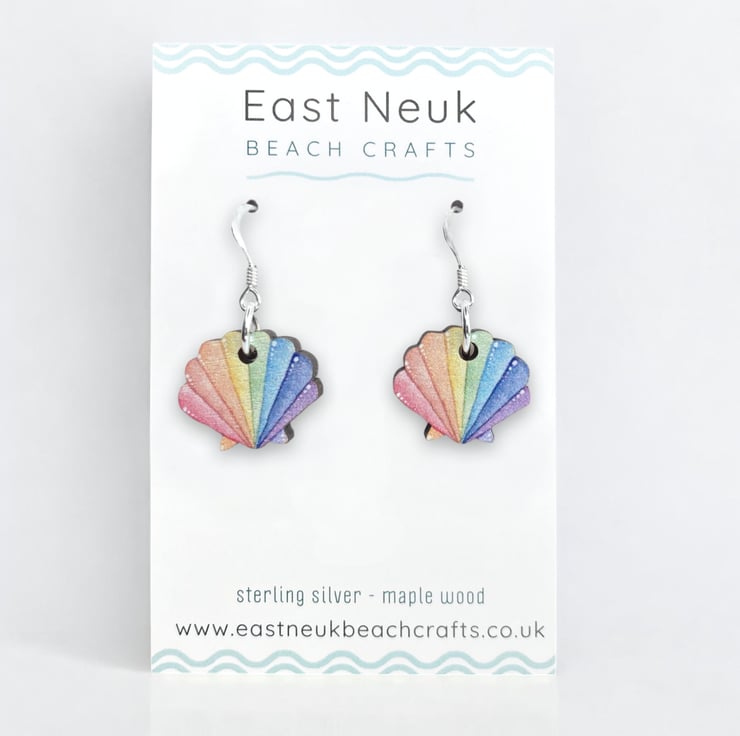 A cute pair of dangly earrings featuring colourful shells. Crafted from beautiful maple wood, the intricate design is printed in vibrant detail, taken from an original watercolour painting.