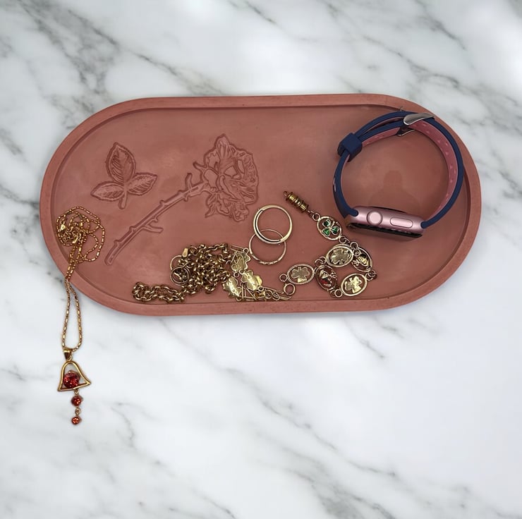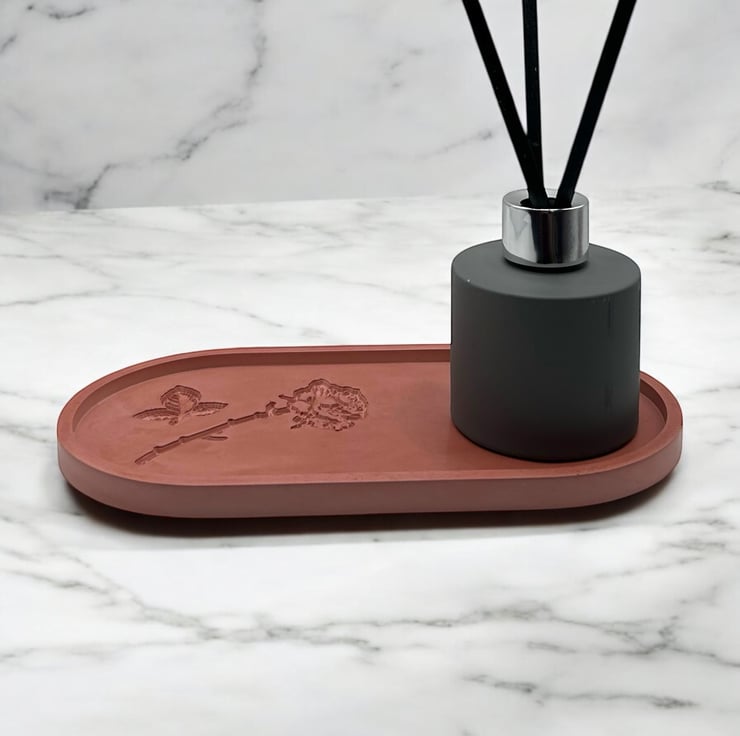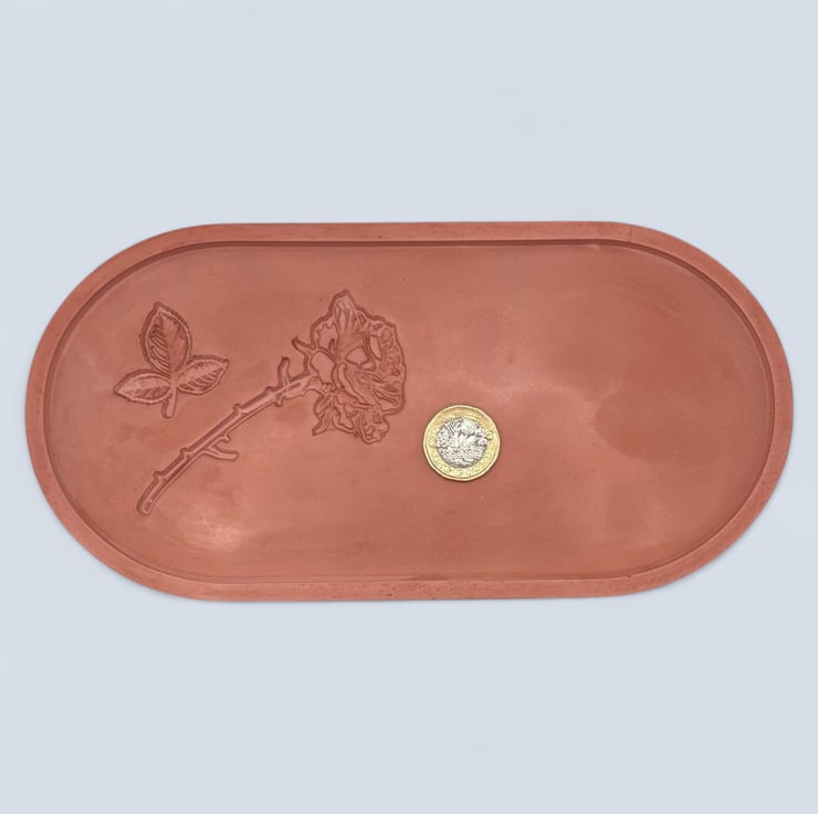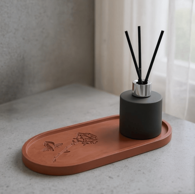 This handmade terracotta-colored oval catchall tray features charming flower imprints on one side. It is a versatile piece suitable for displaying jewelry or trinkets, holding candles and diffusers, or serving as a key tray in the hallway.
