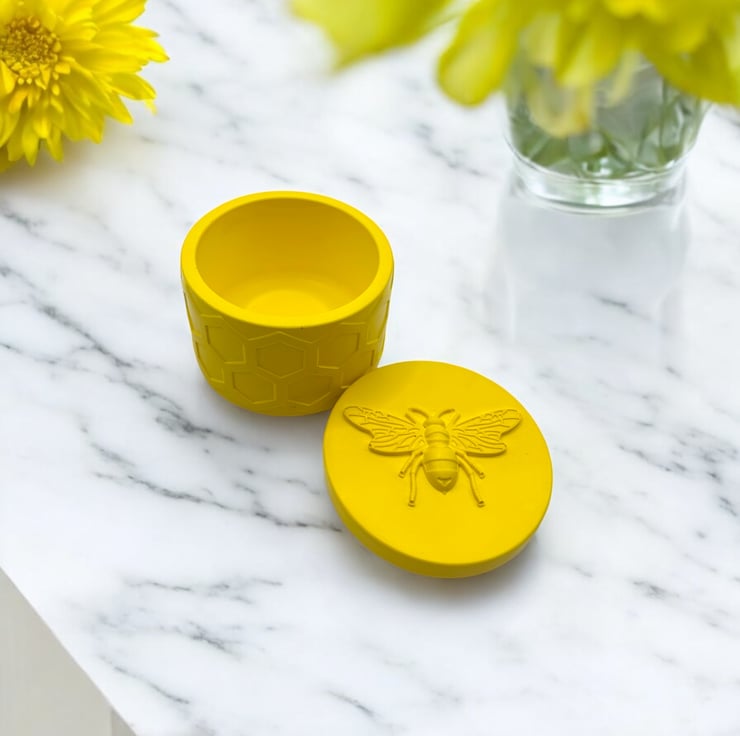 This handmade yellow jewellery box features a honeycomb pattern on the exterior and a raised bee design on the lid. Its bright, cheerful colour makes it a lovely gift for anyone who enjoys bold, modern home decor. It is ideal for storing jewellery, keepsakes or other small treasures.