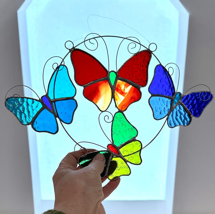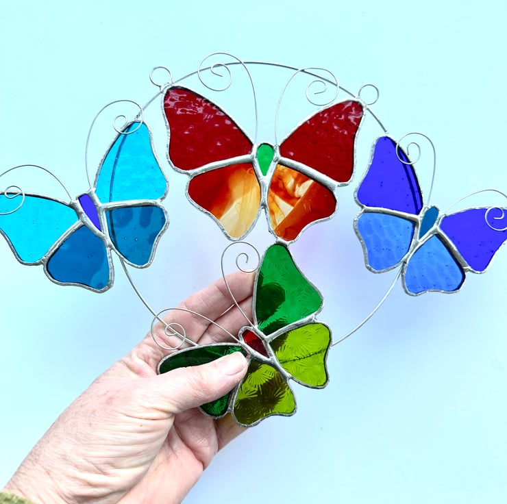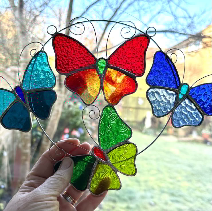 This suncatcher consists of four butterflies made from 4 different combinations of vibrantly coloured stained glass red/amber stained glass..