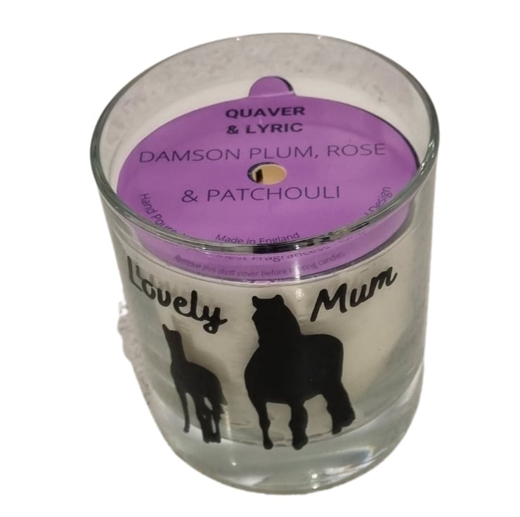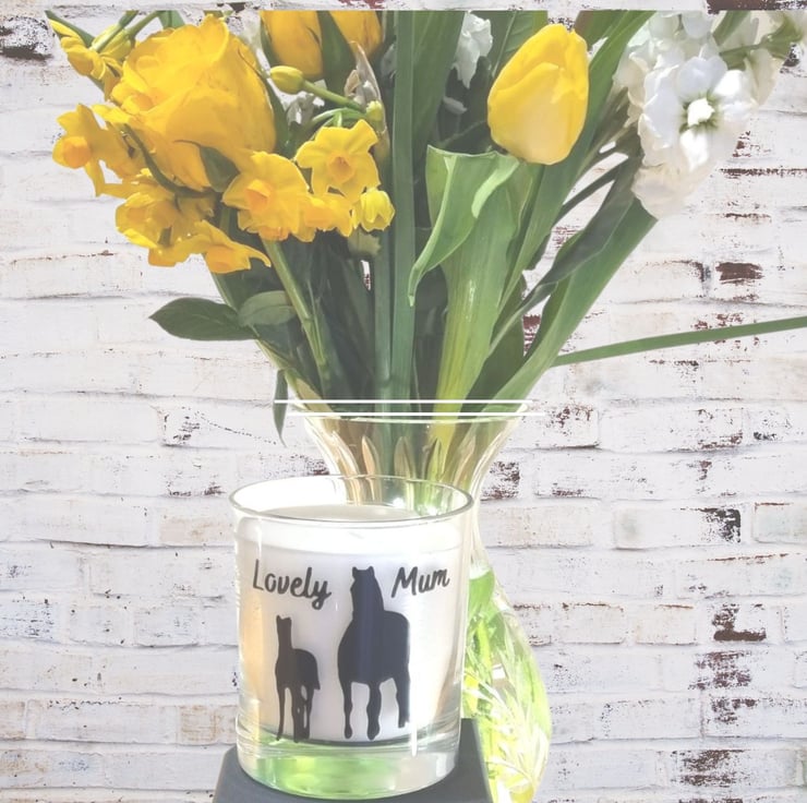 A scented candle with a black vinyl horse design and caption lovely mum. Perfect gift for mother's day or for a Mum's birthday. Handmade using high quality rapeseed and mineral wax blend, the finest range of premium fragrances, poured into quality glass containers and supplied in a kraft box. The design on the scented candle is made from permanent waterproof vinyl which can be cleaned (hand wash only) allowing the glass to be re-purposed as part of your home decor after the candle has burned.