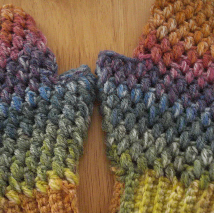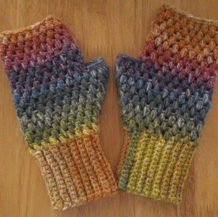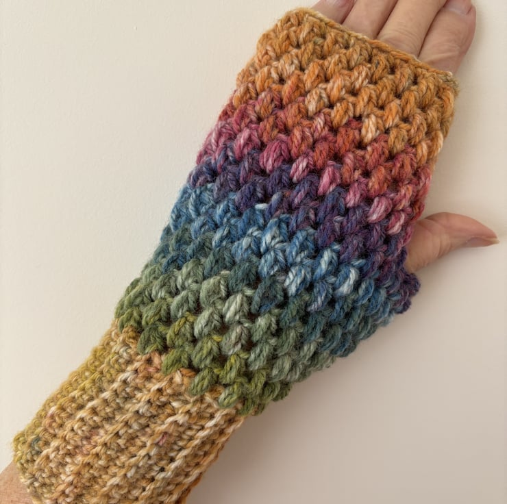 This is a pair of small to medium size multi coloured crochet fingerless gloves. The Aran yarn has a random pattern and I have tried to match them. They fit really snuggly ideal for those cool spring days. Length 21cm.