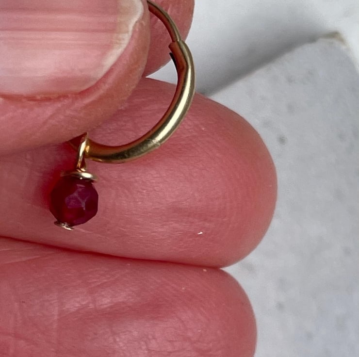 Small 3mm faceted real ruby gemstone charms, with 9ct gold top loops. Perfect to wear as charms on sleeper style hoop earrings or as small necklace pendants, come in pairs, free gift pouch. A best seller. Grade A rubies, image added shows a ruby charm on a hoop earring. The hoop earrings are not included in this listing.