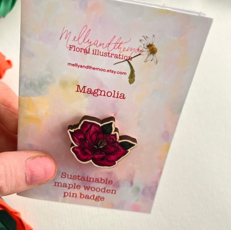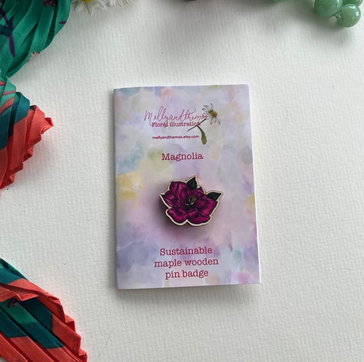 Magnolia's symbolise joy and new life and these little badges are cut from sustainable wood making a great eco friendly gift.