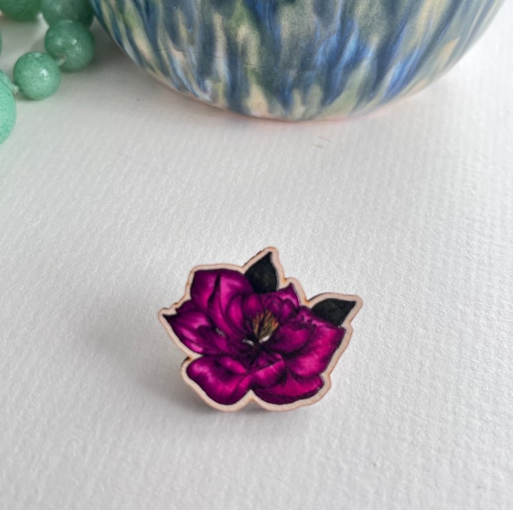 Pretty and dainty petite magnolia pin badge. Sustainable maple wood pin badges made from my hand drawn florals. Laser cut with a darker wood edge these badges make a great addition to a beret or scarf. This bright purple pin badge adds a pop of colour to any outfit and makes an eco friendly gift as these badges are cut in the UK from sustainable wood sources.