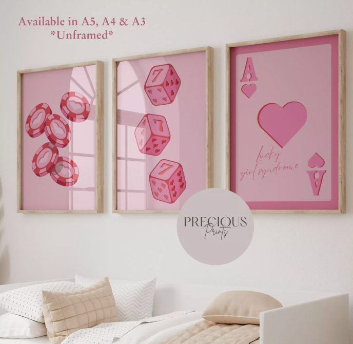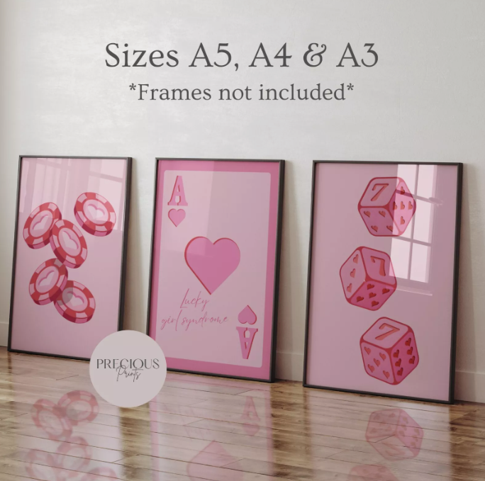 Elevate your space with a set of three 'Lucky Sevens' art prints, each showcasing a dynamic dice and poker chip motif.