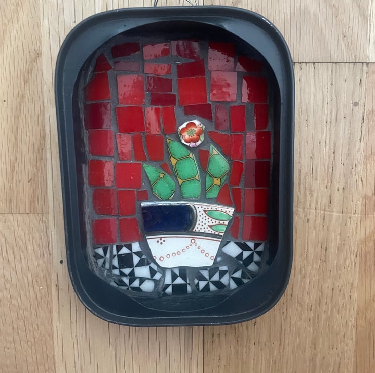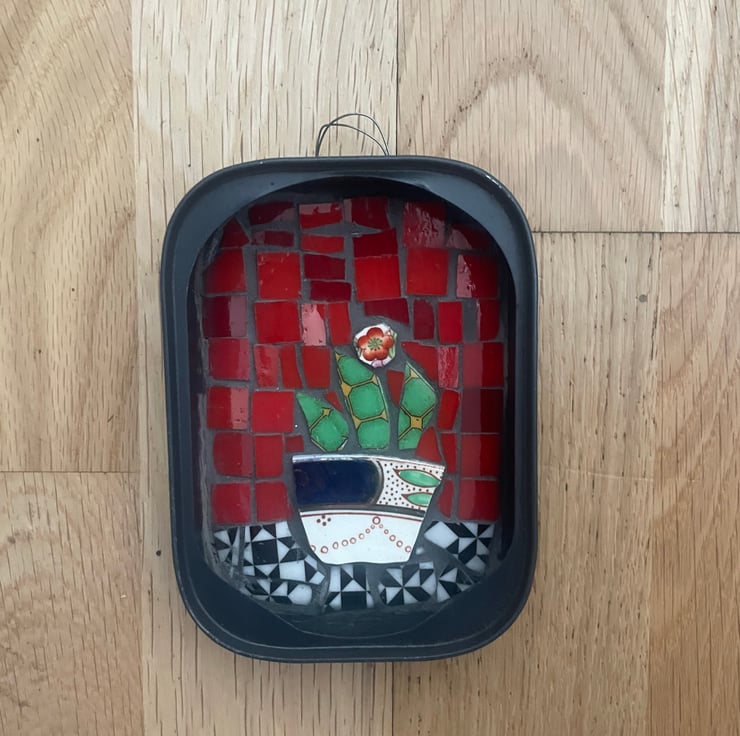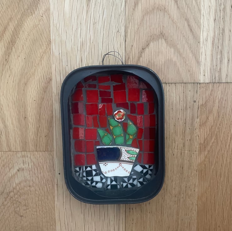 Mini mosaic in sardine tin, little plant with flower in pot. Unique artwork made in East Sussex with lots of love. Made out of broken china plates and little mosaic glass squares. Would make a lovely gift and looks great in kitchen, hallway or any other room. With wire loop on the back for easy hanging options.