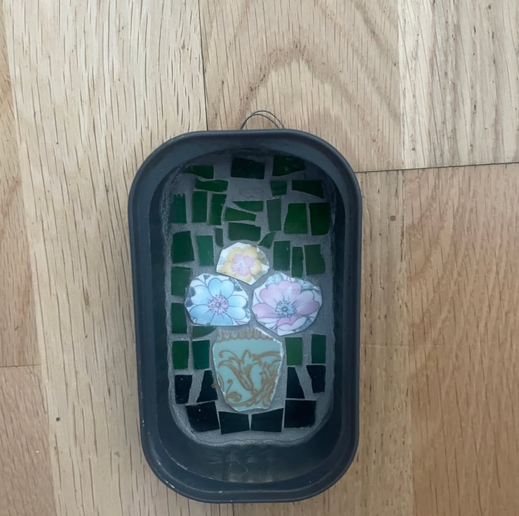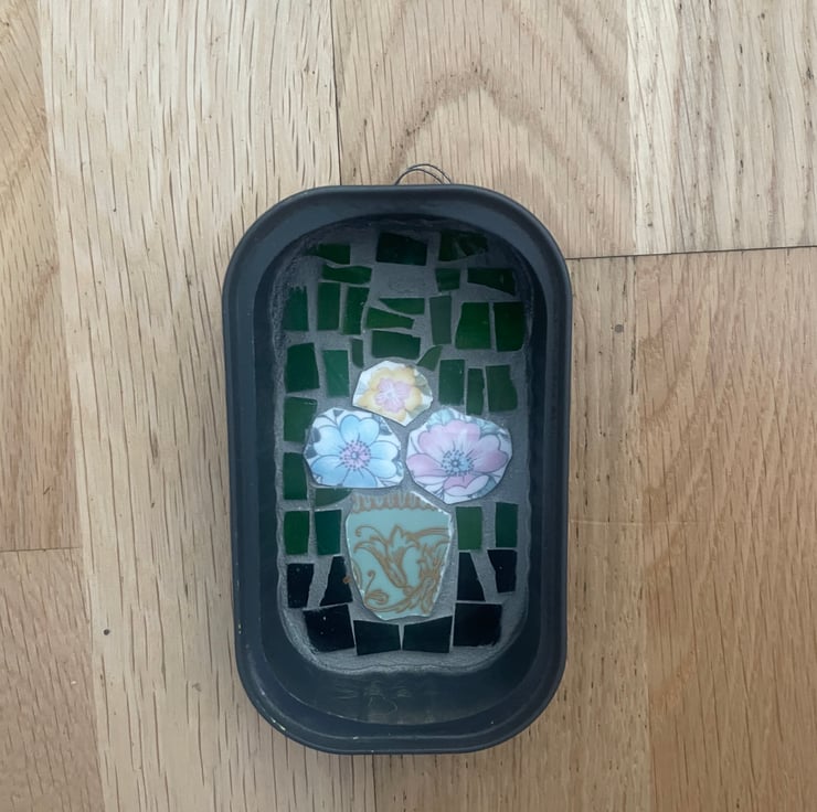 Mini mosaic in sardine tin, flowers in jug. Unique artwork made in East Sussex with lots of love. Made out of broken china plates and little mosaic glass squares. Would make a lovely gift and looks great in kitchen, hallway or any other room. With wire loop on the back for easy hanging options.