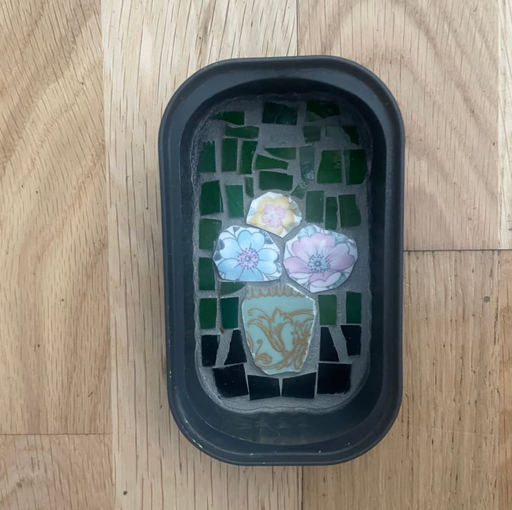 I work a lot with fabrics but wanted a little change and explore some different materials. I came across some pictures of mini mosaics in sardine tins online and loved the idea so much, so I wanted to try it out myself. Since then I started to collect old and broken china with pretty patterns and started making my little mosaics. I absolutely love creating those little beauties and will make many more. I hope you like them too.