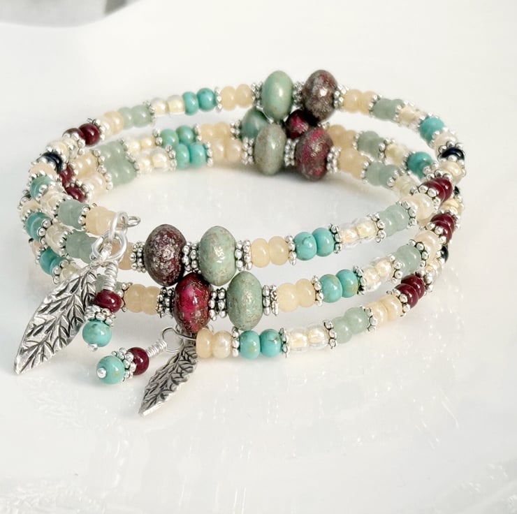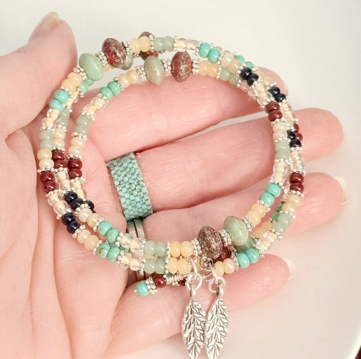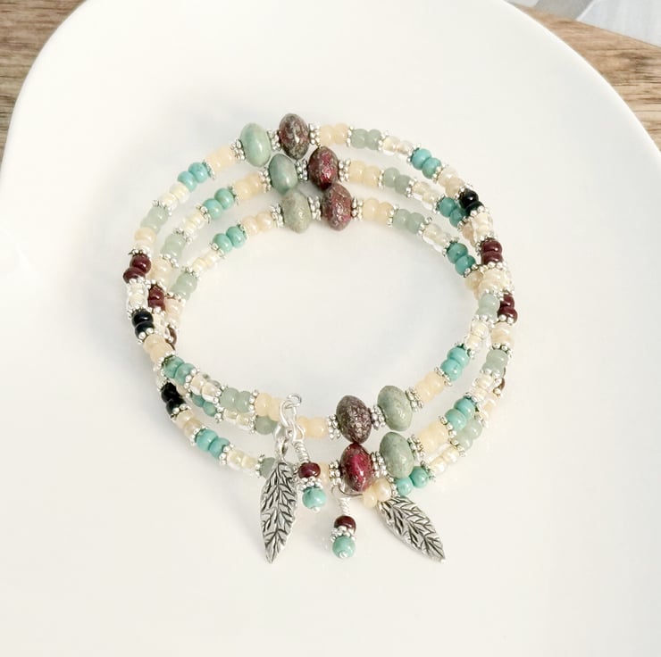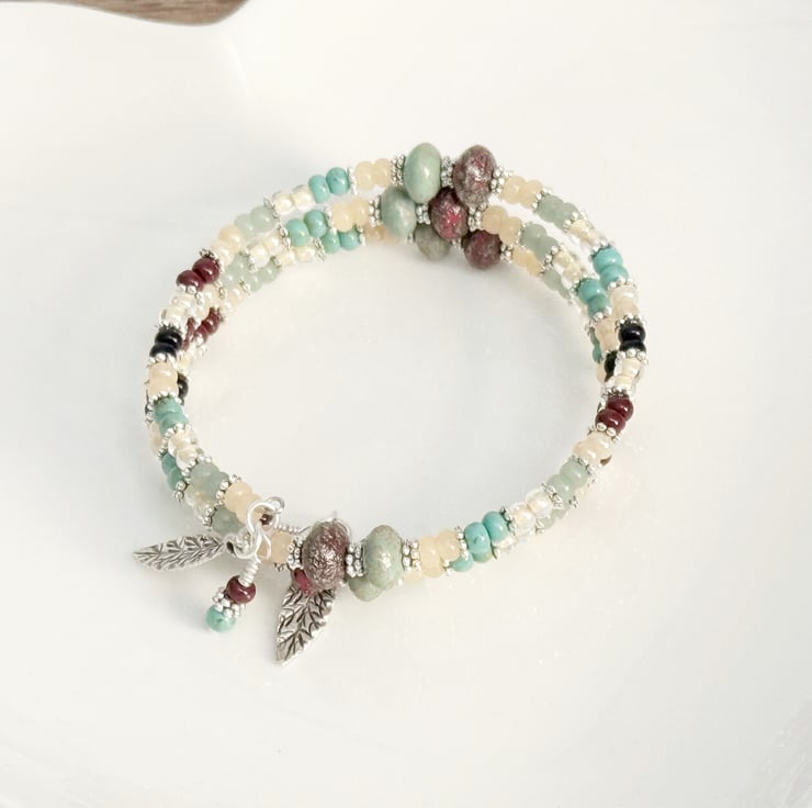 Boho style beaded wrap bracelet in sage green and deep red colours. The beads have been threaded onto memory wire in blocks of coloured seed beads in sage green, cream and dark blue tones. There are also chunky oval beads in complimenting green and red colours, these beads have a rustic finished to them.