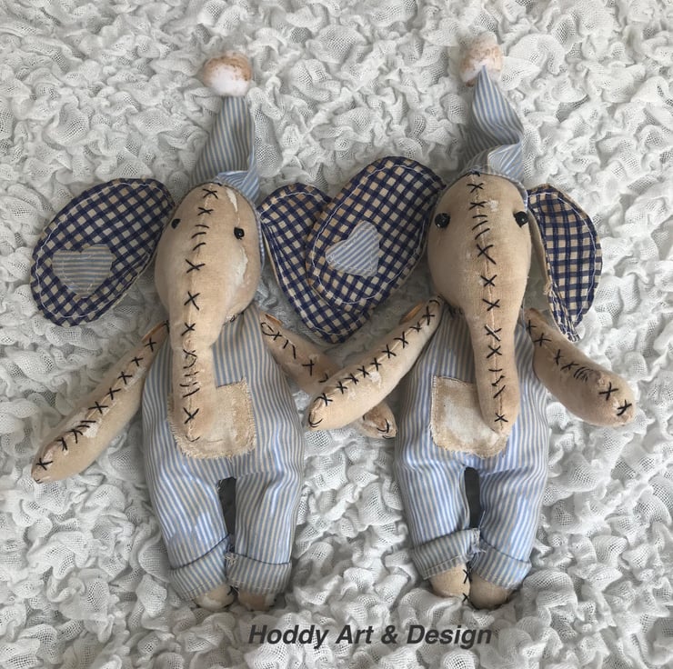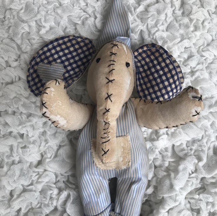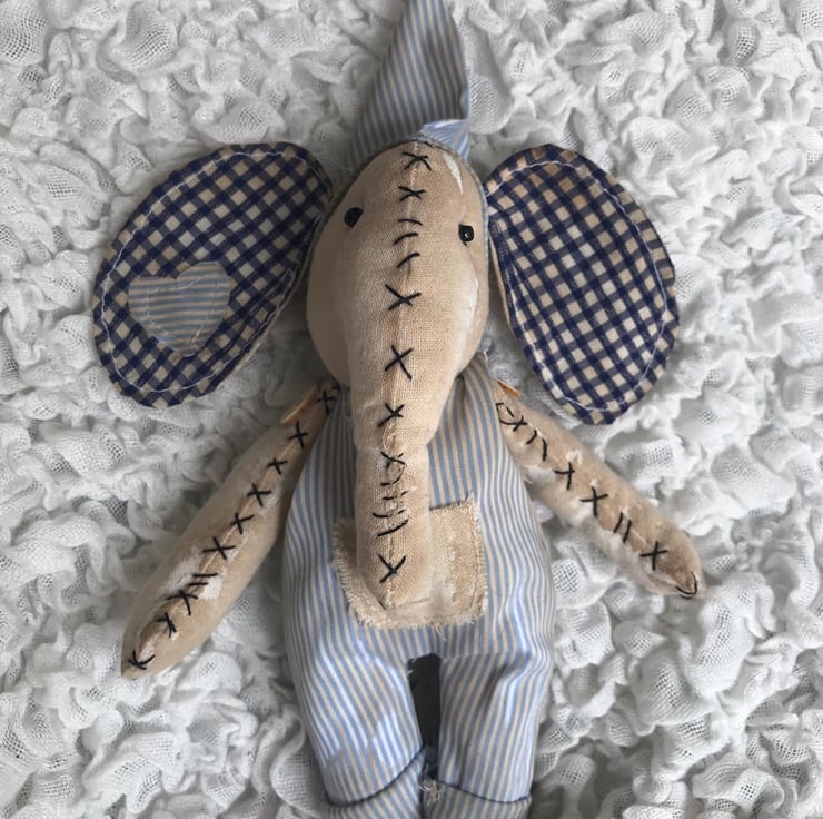 Meet this adorable handcrafted vintage-style elephant, lovingly created with a nostalgic, timeworn charm. Dressed in soft, aged dungarees and wearing a whimsical fabric hat with a tiny pompom, this unique elephant is full of character and charm.