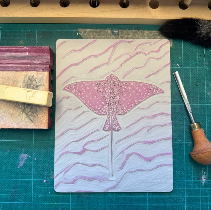 It has been fully carved in Lino by hand and the ray was carefully cut out of the background. It was then printed as two layers, first the blind embossed background followed by the inked layer.