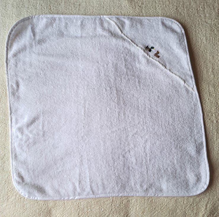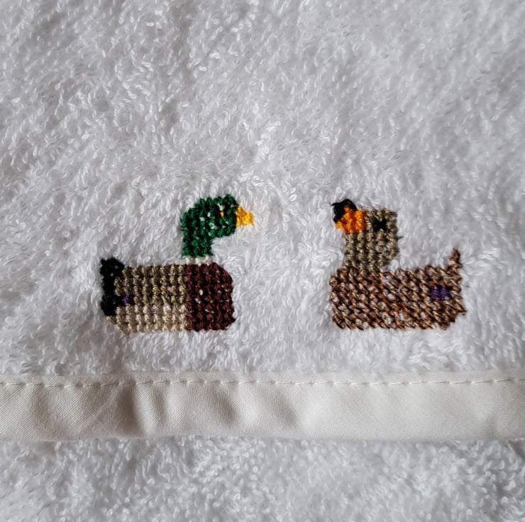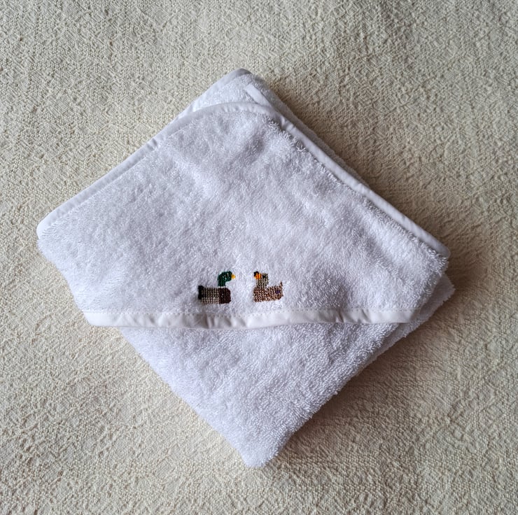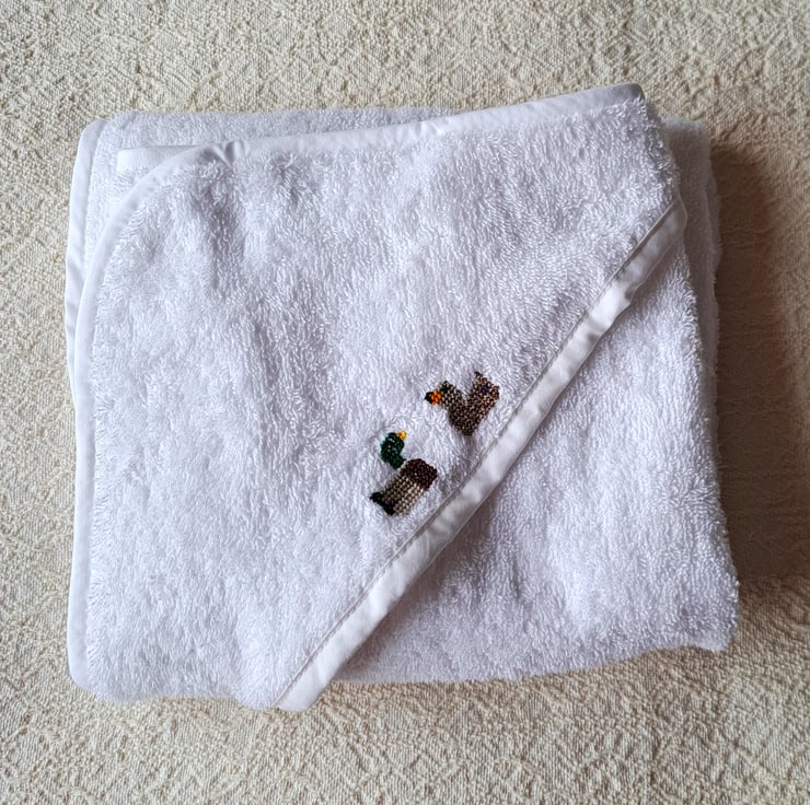 I have hand embroidered two mallard ducks one duck and one drake, facing each other on this lovely soft white hooded baby towel from Tesco. Bound with white bias binding, it measures 70cm.(27") square approximately, is all cotton and can be machine washed.