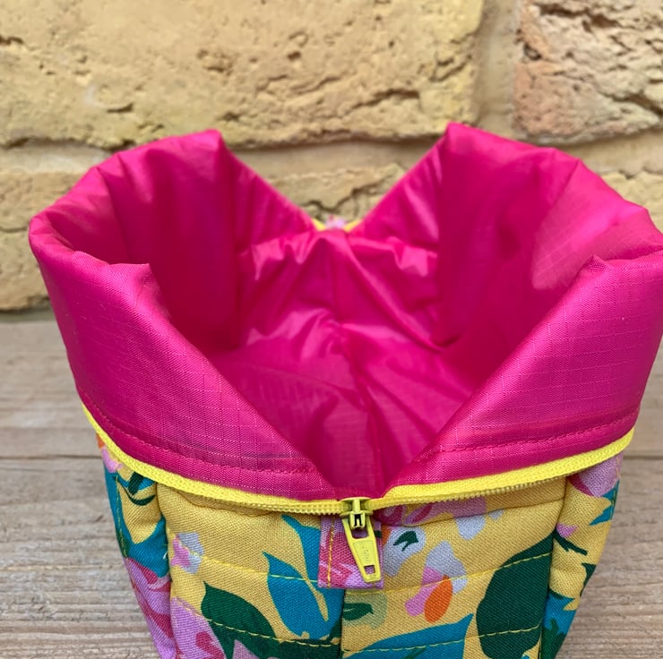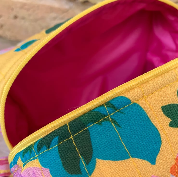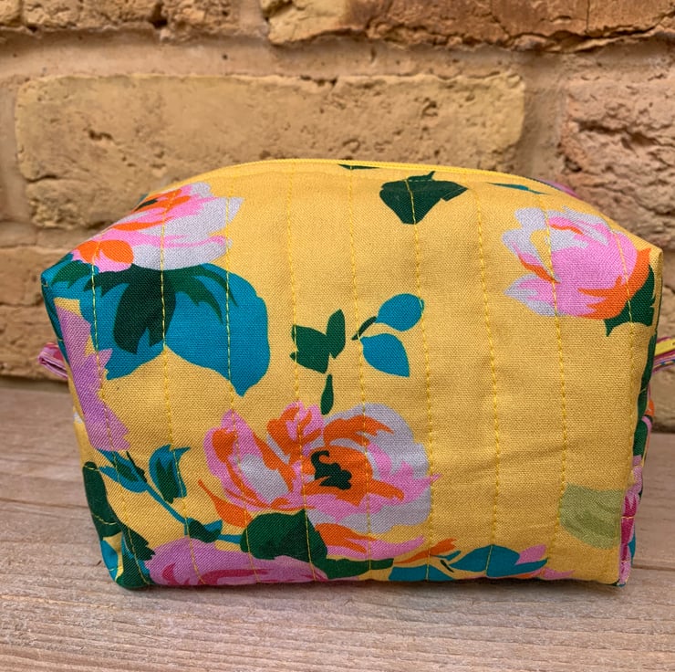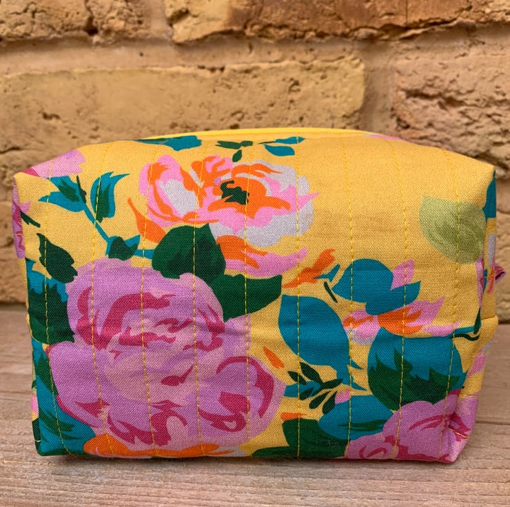 The box shape makeup bag is made in the beautiful floral print with a yellow background - perfect for spring and summer!