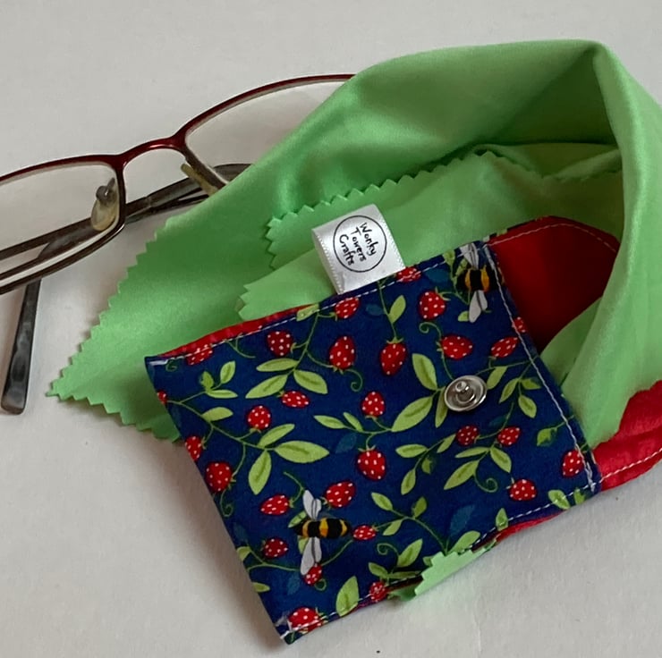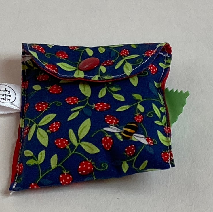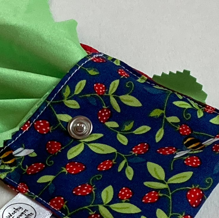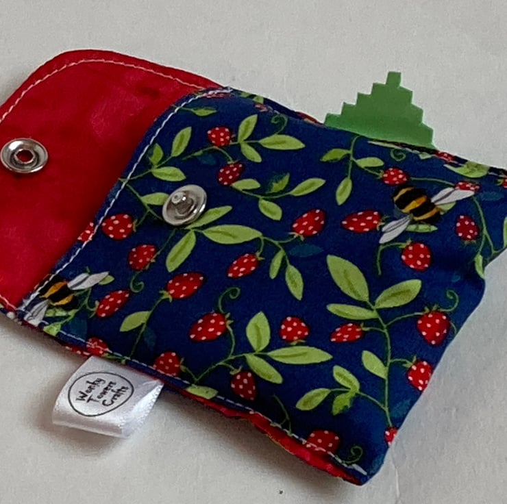 This tiny pouch measures approximately 8 x 8cm and is made from navy cotton decorated with strawberries and bees. It is secured with a plastic snap. Inside the pouch is a large, green microfibre cloth, measuring 21cm square. It is sewn into the seam of the pouch. When you need to clean your lenses, just pull the cloth out, leaving the pouch hanging. When you're done, fold the cloth and pop it back in - the red silky lining of the pouch makes this very easy.