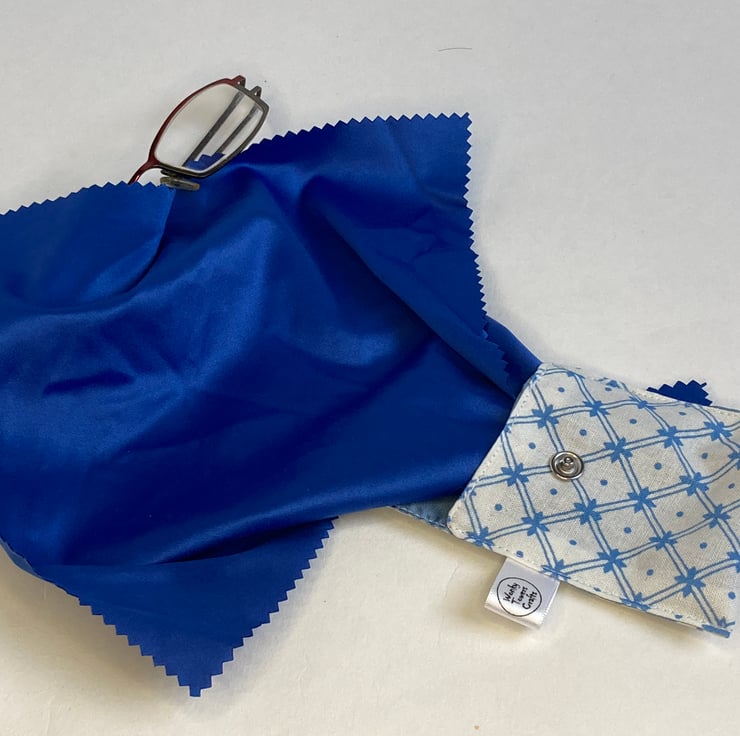 This tiny pouch measures approximately 8 x 8cm and is made from white and blue checked cotton. It is secured with a plastic snap. Inside the pouch is a large, royal blue microfibre cloth, measuring 21cm square. It is sewn into the seam of the pouch. When you need to clean your lenses, just pull the cloth out, leaving the pouch hanging. When you're done, fold the cloth and pop it back in - the pale blue silky lining of the pouch makes this very easy.
