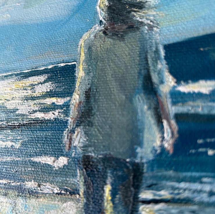 It is a loose, lively painting of a woman walking on a beach.