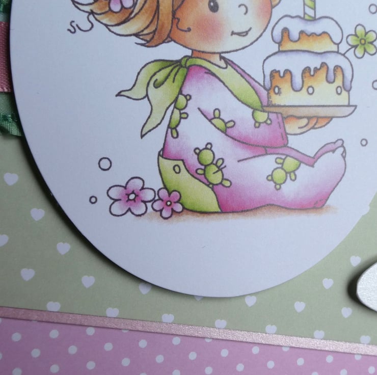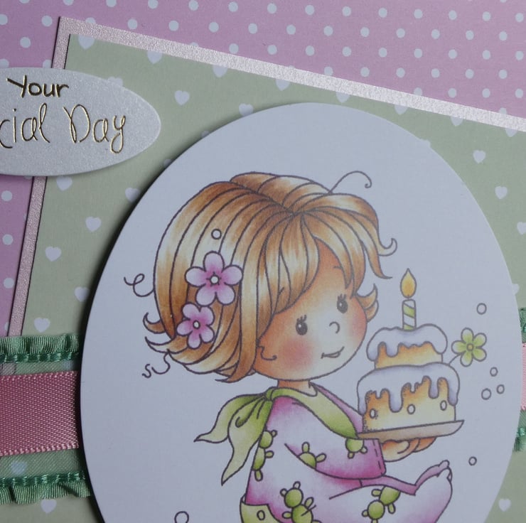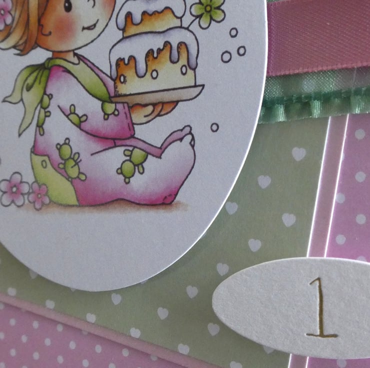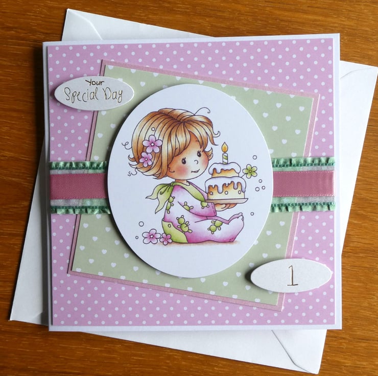 With the messages Birthday Girl and Your Special Day this cute card in shades of pink and green for a little girls first birthday has a printed topper showing a little girl holding a birthday cake with one candle.
