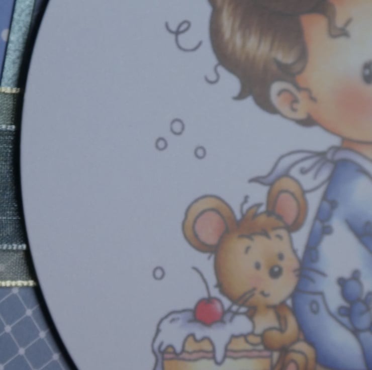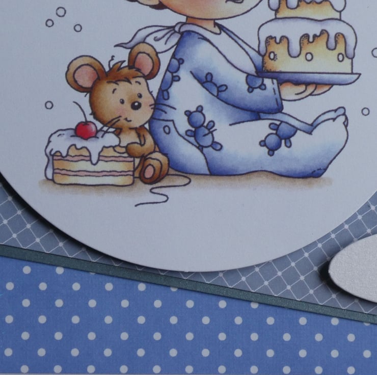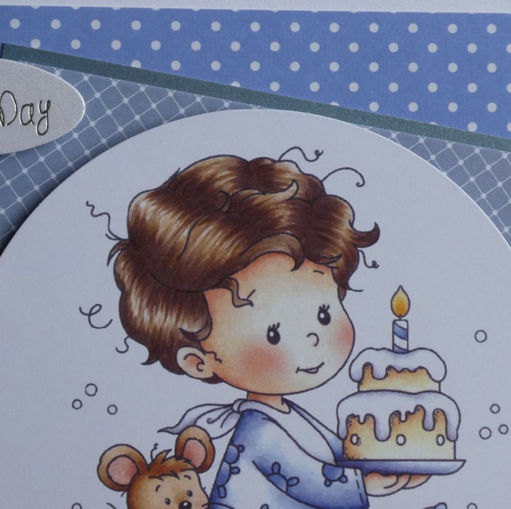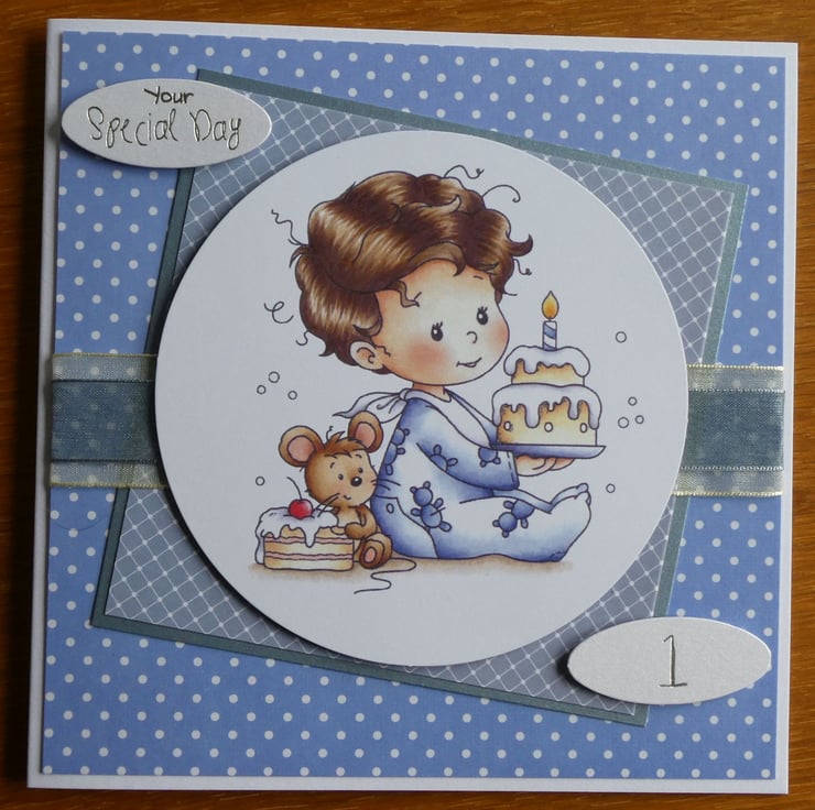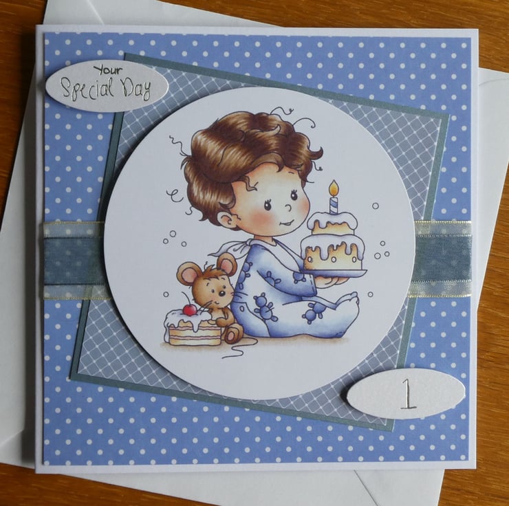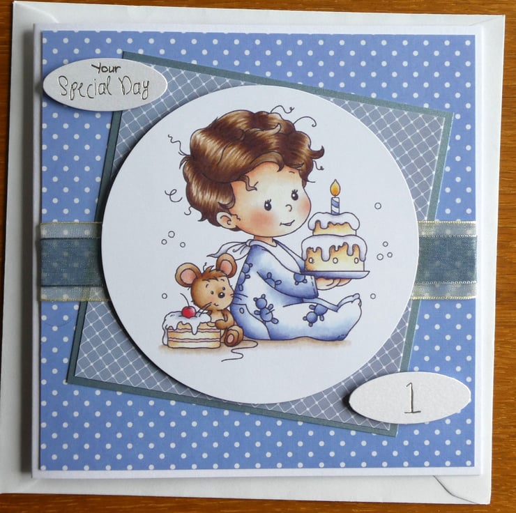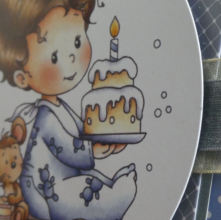With the messages Birthday Boy and Your Special Day this cute card in shades of blue for a little boys first birthday has a large circular printed topper showing a little boy holding a birthday cake with one candle.