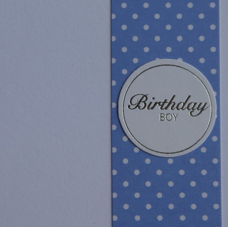 The inside of the card has a band of matching polka dot card down the right hand side with another oval message with the words birthday boy, leaving plenty of space for you to write your own message.