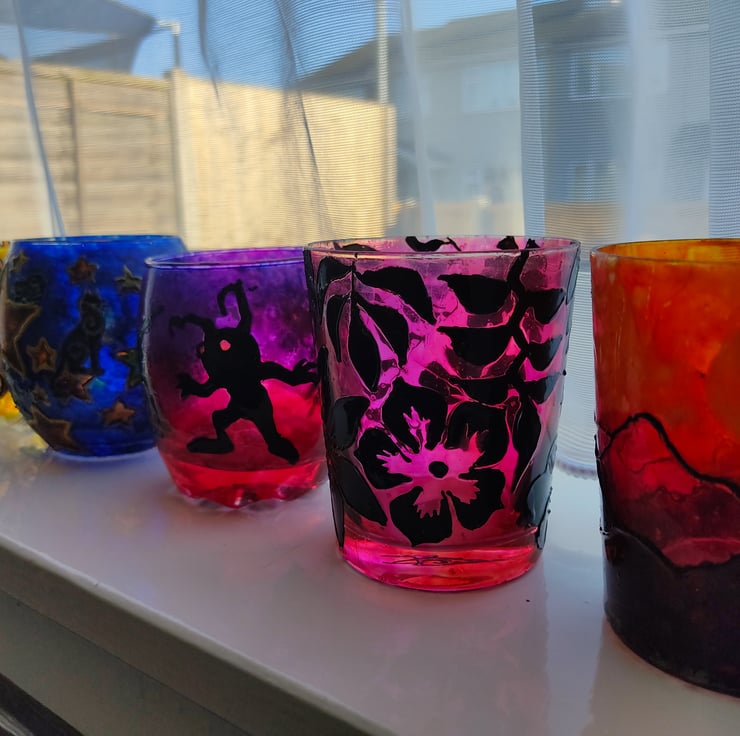 Black opaque silhouettes of tropical flowers and plants, painted over a purple - violet background on a v-shaped glass with glass paints and covered with transparent varnish for protection.