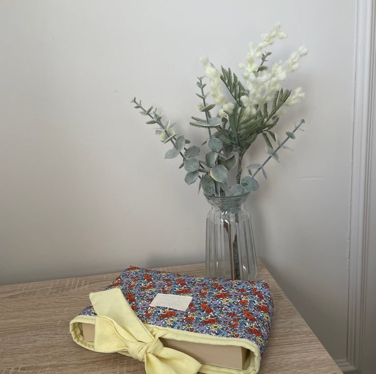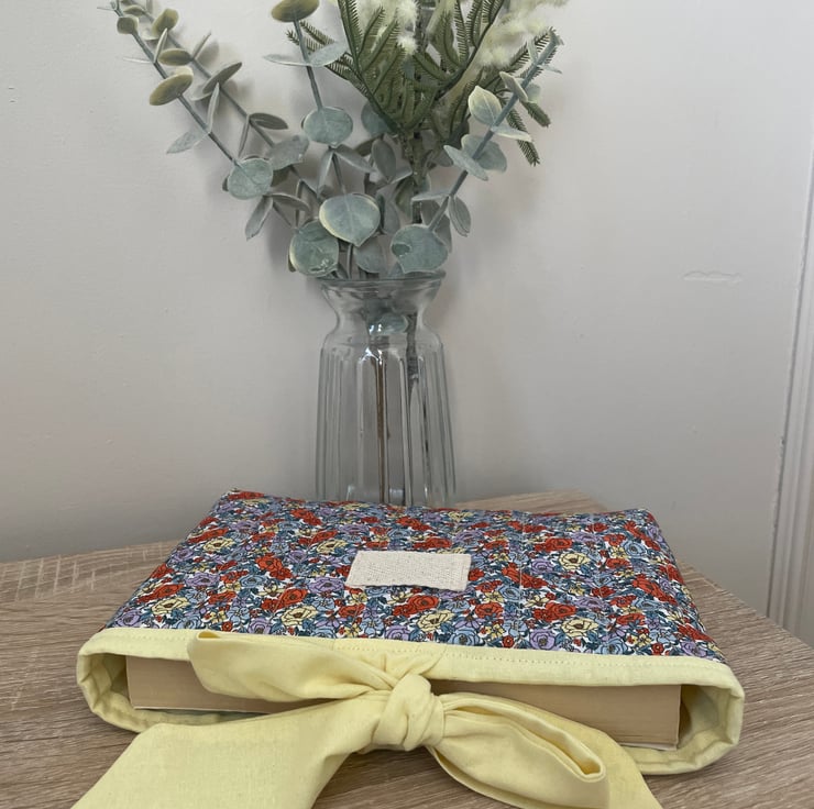 Floral pattern book sleeve, which can be tied at the top to keep your book secure. Perfect for anybody who likes to take their books out with them so they don’t get damaged in the bottom of your bag. For average size paperback books, it will fit the largest Harry Potter book with a bit of a squeeze. I can also personalise the small tab on the front using an iron on vinyl with a name, Mummy’s book or My book or something similar as long as it not to long.