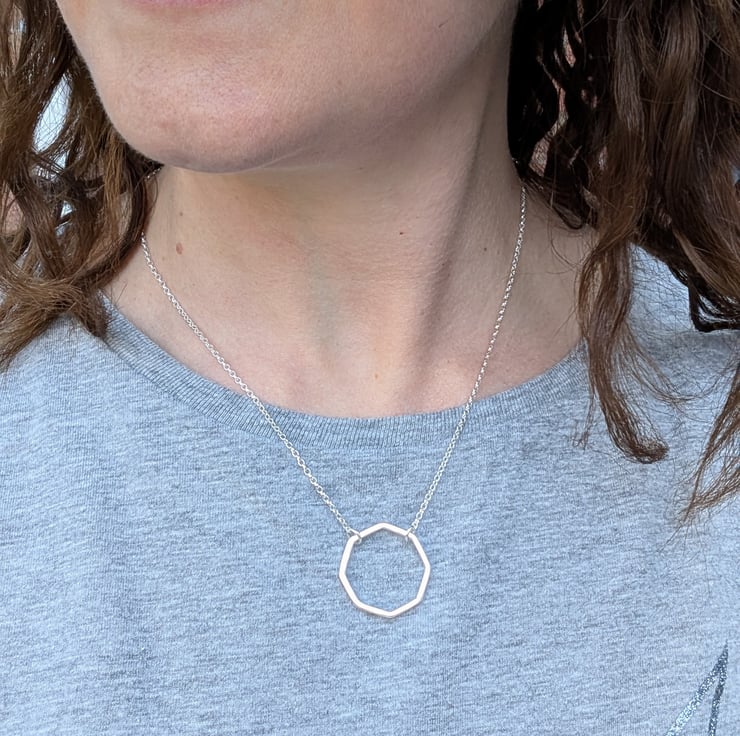 This handmade necklace features an open octagon pendant, crafted from recycled sterling silver for a minimal yet striking design. The clean geometric lines create a modern look, while the polished finish reflects light beautifully. Suspended from a delicate sterling silver chain, this necklace is effortlessly stylish and lightweight, perfect for everyday wear or layering with other pieces.