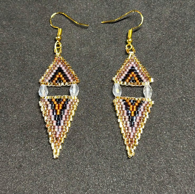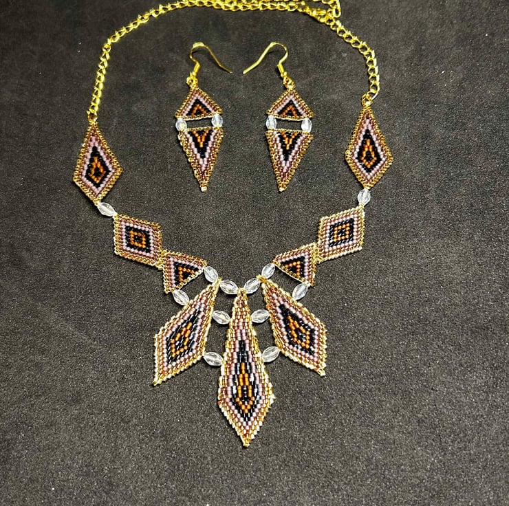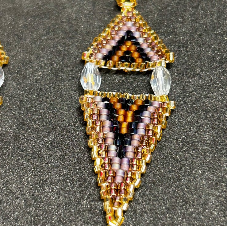 Each element of this design is hand-sewn, and as I assembled it, the design reminded me of Phoenix feathers, so I had to call it Phoenix. The triangular elements are bound by fabulous Austrian Crystals which reflect a myriad of colours to compliment the colours of the glass seed beads perfectly.