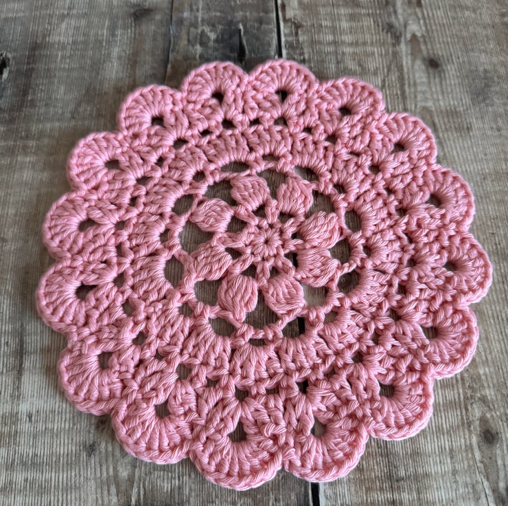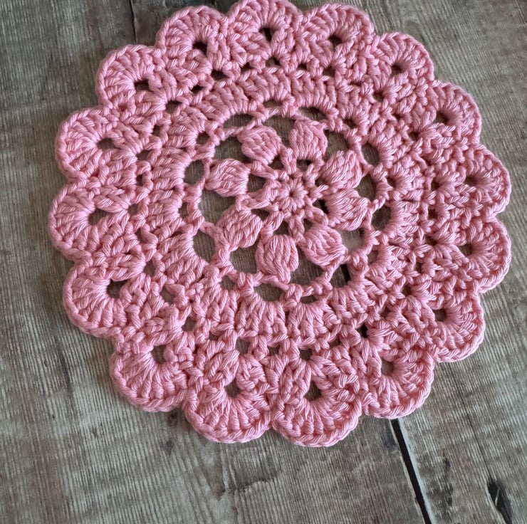 Hand crocheted pink cotton coaster doilie