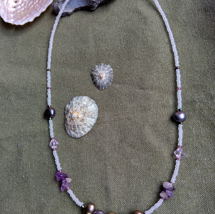 This unique handmade beaded necklace includes at its centre five dark multi-coloured pearls, paired on either side with raw amethyst pieces, crystal-cut Czech glass beads of pale lilac, and white glass seed beads. It is finished with a hand-shaped clasp made of 925 sterling silver wire.