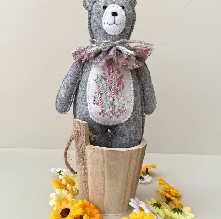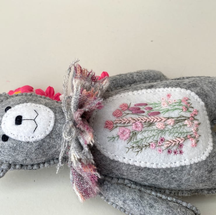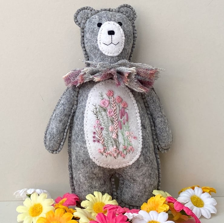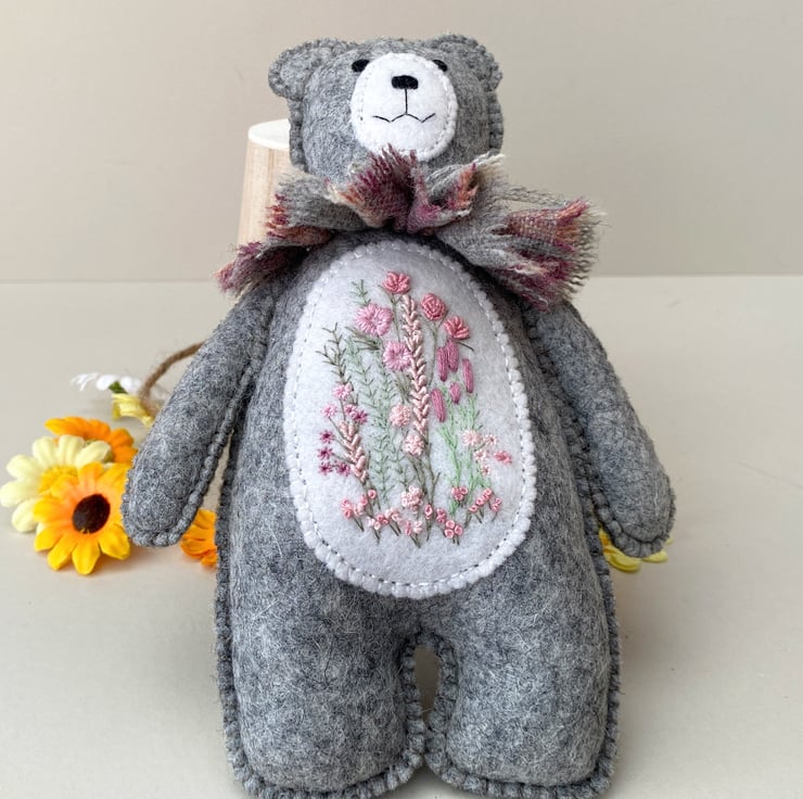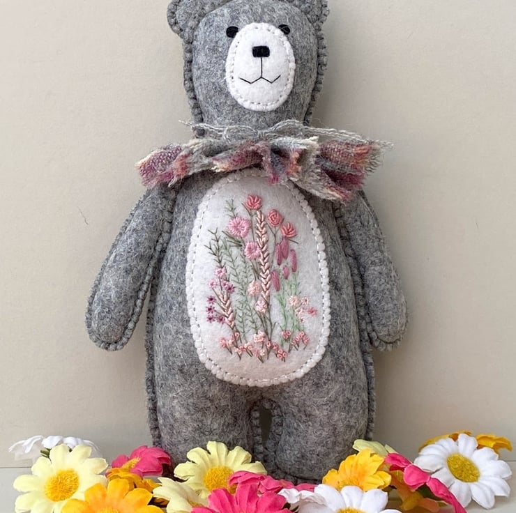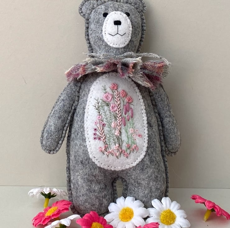 Bear has been hand sewn with triple seams for stability and decoration and has a lovely patch of hand embroidered flowers to his middle in pale pinks and greens, hand sewn onto contrast white wool felt.