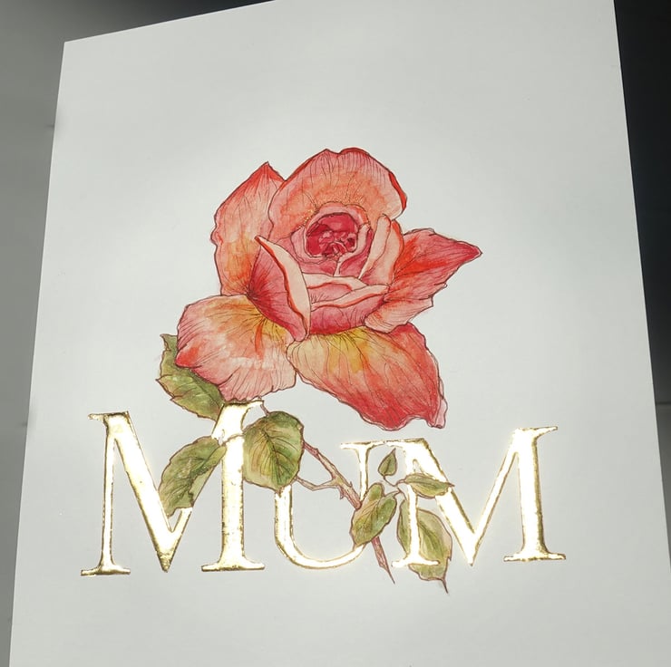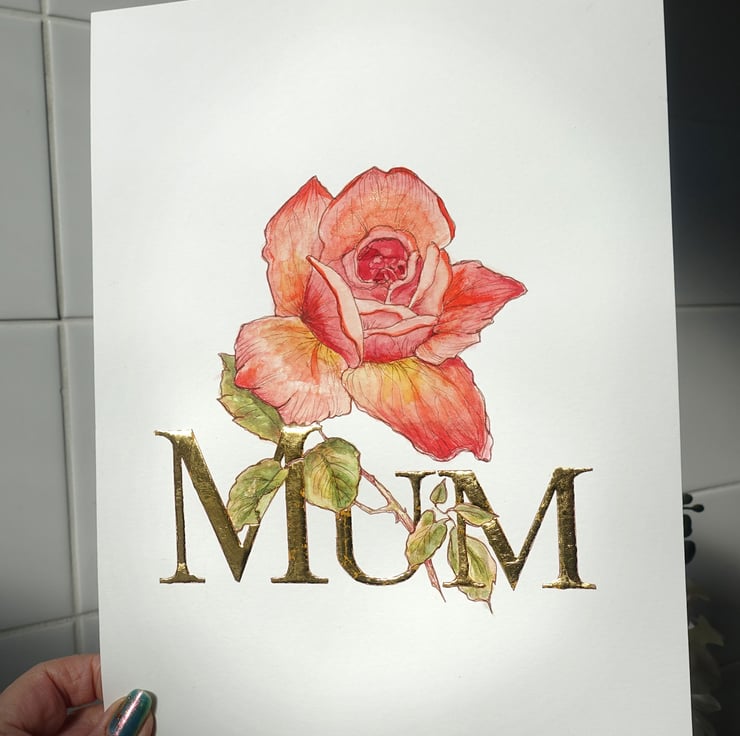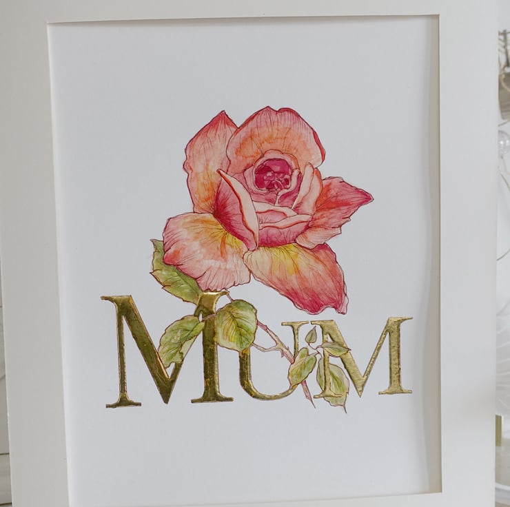 Large A4 original watercolour rose entwined around the word Mum in 23.5 carat gold leaf.