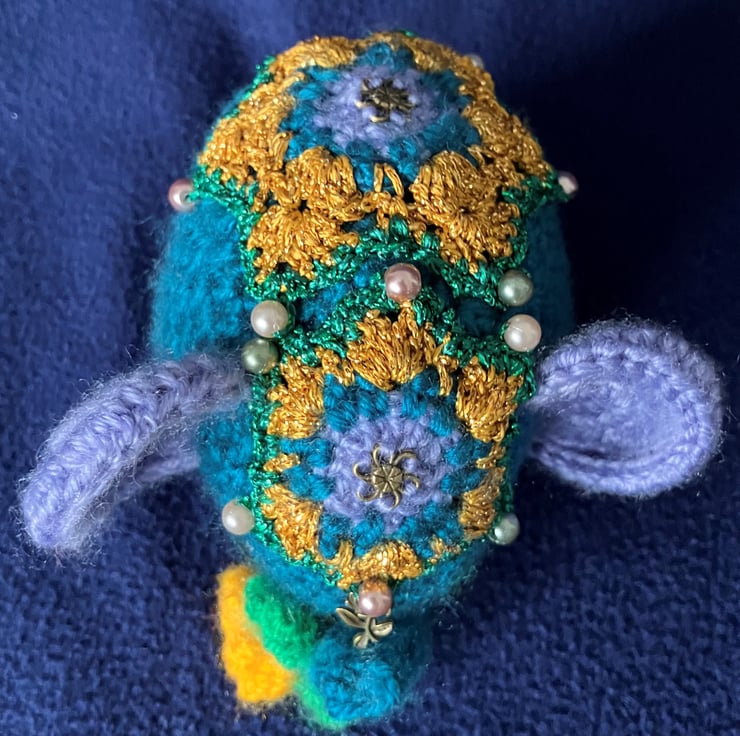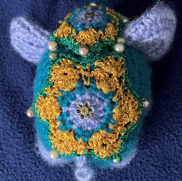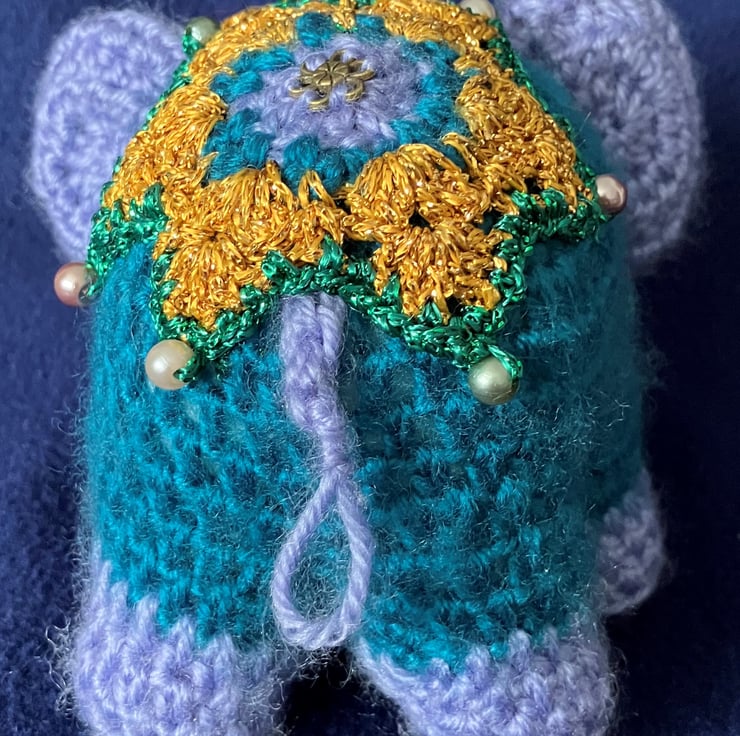 This is a handmade crocheted elephant that has been decorated with beads, two antique metal flower charms and a metal rose charm. Glitter yarn in colours green and gold have been used for the headdress and blanket.
