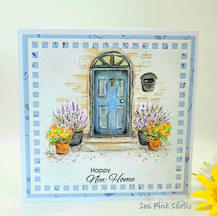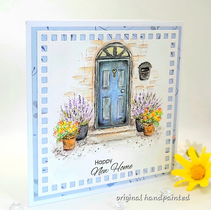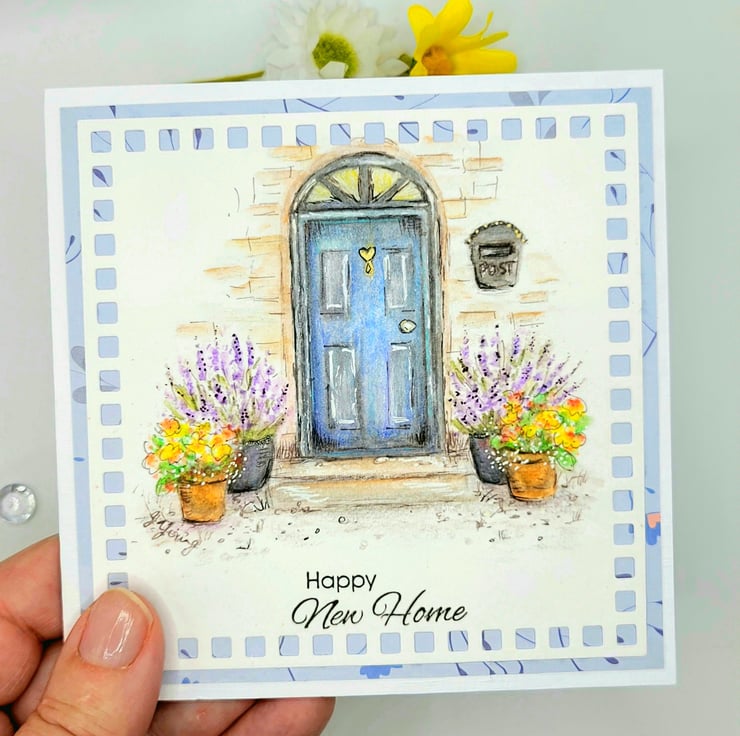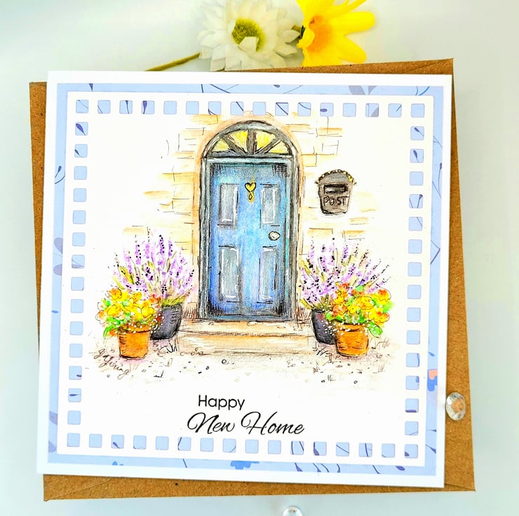 A handpainted new home card, with a blue front door, steps and some lovely pots of lavender and flowers. I've added a little post box and brick details too. The card is an original sketched and watercoloured card, so you will be buying something unique. Measuring 12.5 x 12.5 cms, the card is supplied with a 100% recycled brown kraft paper envelope. It is blank inside for writing a personal message.