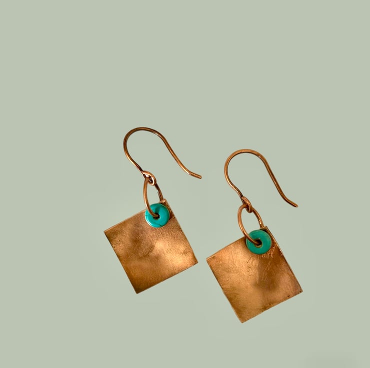 These beautiful earrings are vibrant, extremely eye catching unique and stylish. I have oxidised these earrings which is a process involving dipping the copper in liver of sulphur, once I get the desired oxidisation I remove from the solution and then the earrings are thoroughly washed To stop any further oxidisation. I then use wire wool to remove the heavier oxidisation and once happy I finish the process by spending time to polish and highlight the beautiful colour the oxidisation has achieved. I have also domed these earrings giving them a stylish look, the dome is inverted, I really love them, hope you do too. Drop is approx 1”. Cute semi precious turquoise stone heishi beads have been added for a colour splash.