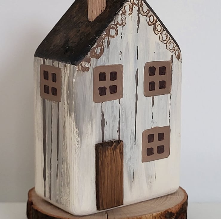 Unique hand crafted and hand painted little wooden house with wooden chimney.