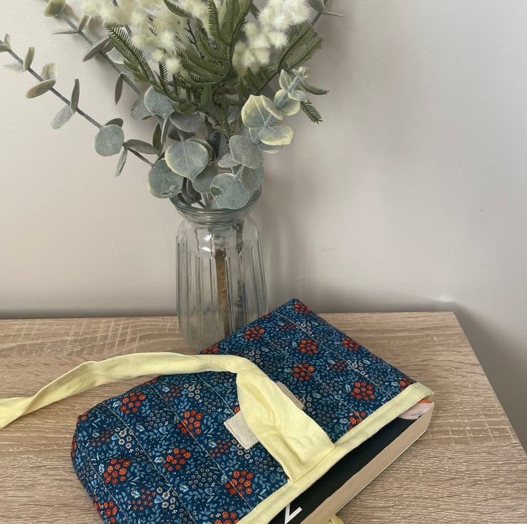Floral navy pattern book sleeve, which can be tied at the top to keep your book secure. Perfect for anybody who likes to take their books out with them so they don’t get damaged in the bottom of your bag. For average size paperback books, it will fit the largest Harry Potter book with a bit of a squeeze. I can also personalise the small tab on the front using an iron on vinyl with a name, Mummy’s book or My book or something similar as long as it not to long.