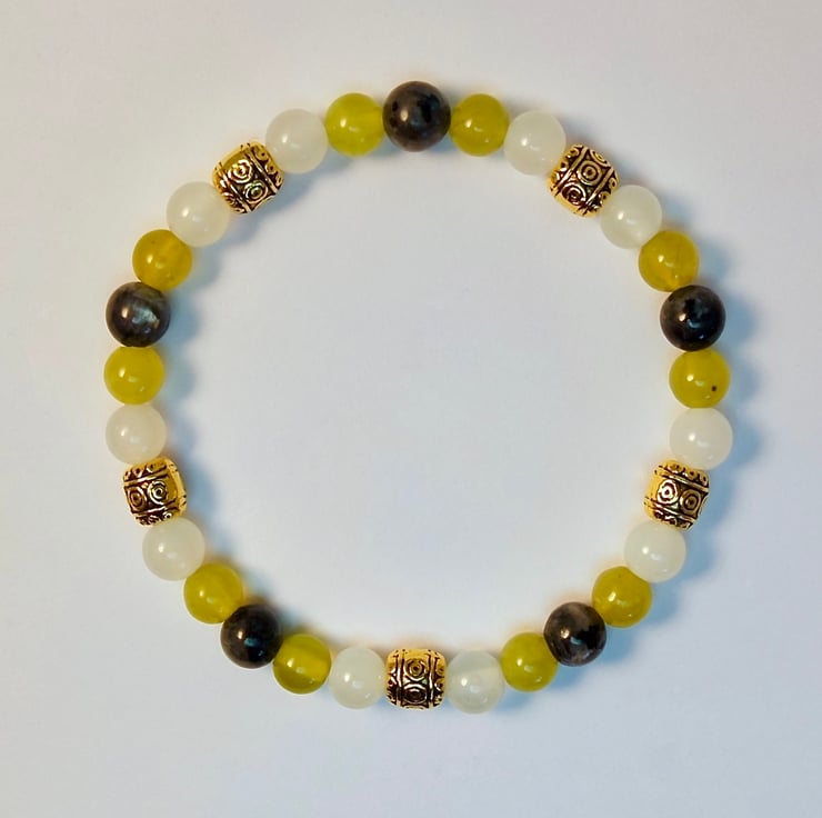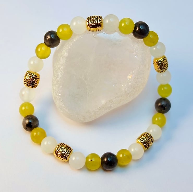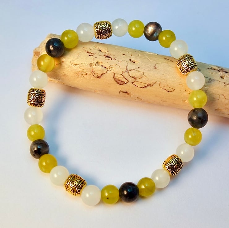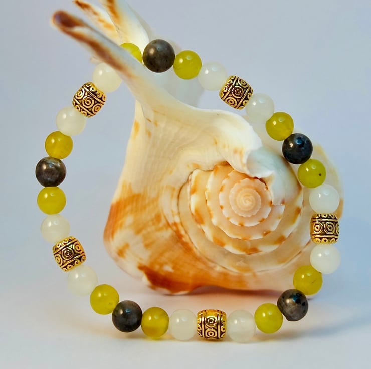 A mix of 6mm Larvikite, New Jade and Olive Jade with Tibetan style antique gold barrel beads.