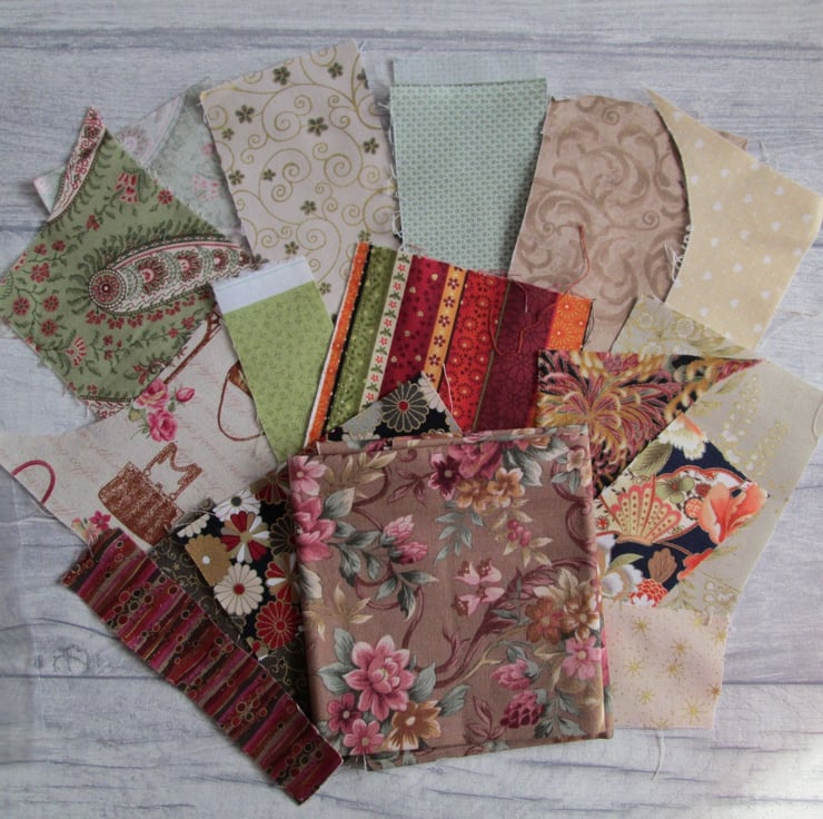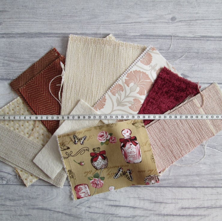 A carefully curated selection of autumnal toned fabrics in various weights for slow stitching or other craft projects. Some upholstery weight fabrics, some quilting cottons, in an assortment of colours ranging from cream, through gold, peach, copper and sage to soft pinks and coffees. Fabric sizes range from treasured snippets a couple of inches square to a full fat quarter. An A4 piece of medium weight interfacing is also included as a base fabric.
