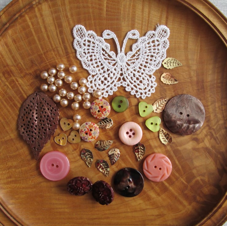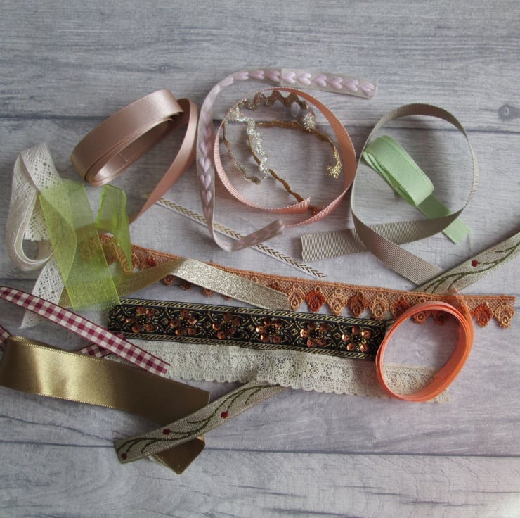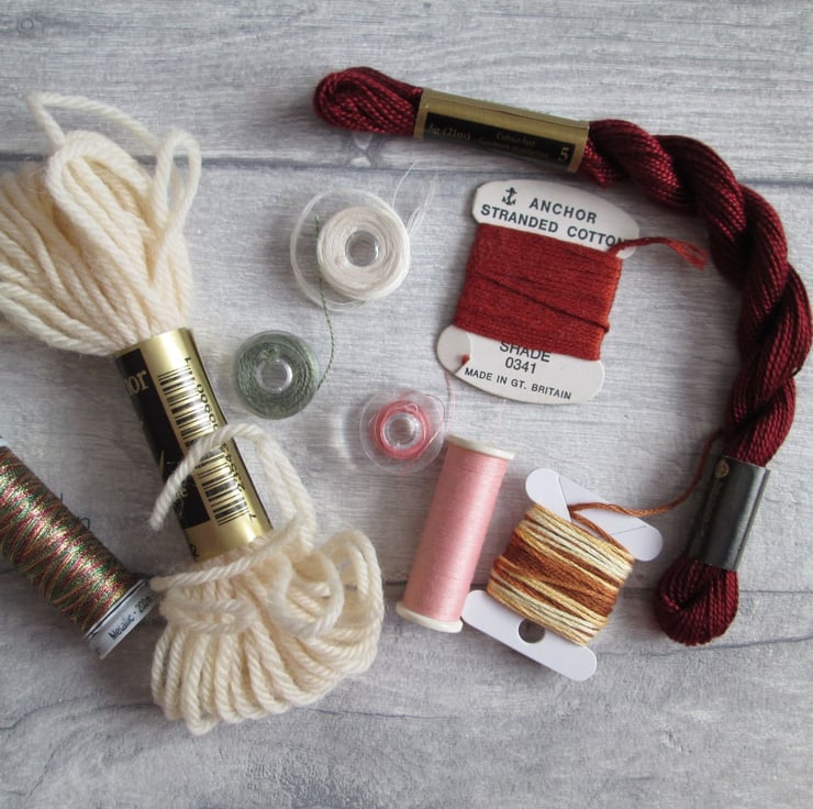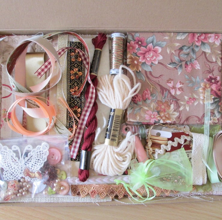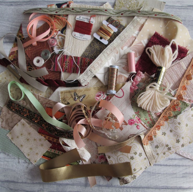 The upholstery weight fabrics include brocades and chenille, some of which are shot with metallic thread. Also included are coordinating embroidery threads, tapestry wool and sewing cotton, plus ribbons, braids, lace, beads, buttons and sequins, and a reel of Gutermann Sulky variegated metallic thread. Some items are vintage. The pack would make a lovely gift for a crafter.