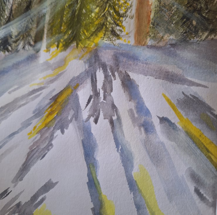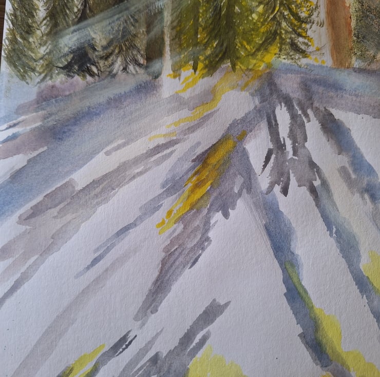 A4 watercolour painting ,depicting winter woodland ,snow forest with shadows cast across the snow .