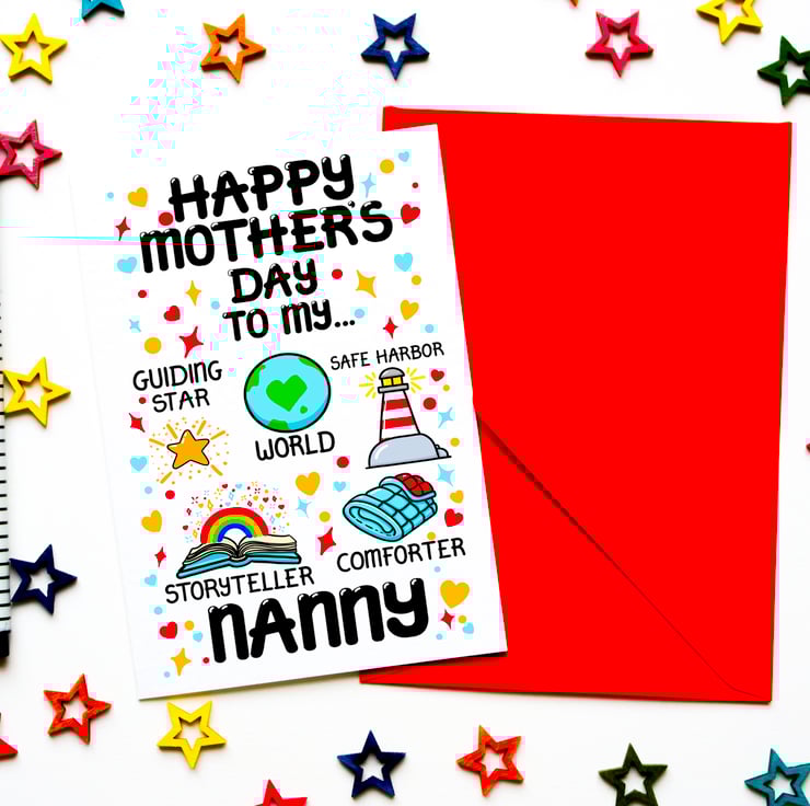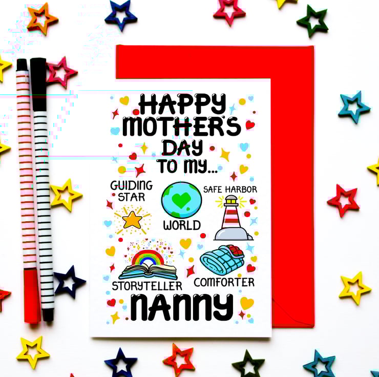 Show your Nanny just how much she means to you with this heartfelt Mother’s Day card, designed with love and care. Featuring a beautiful selection of sentimental words—including guiding star, storyteller, comforter, and safe harbour—each with a charming hand-drawn illustration, this card is a touching tribute to the special bond between a grandchild and their nanny.
