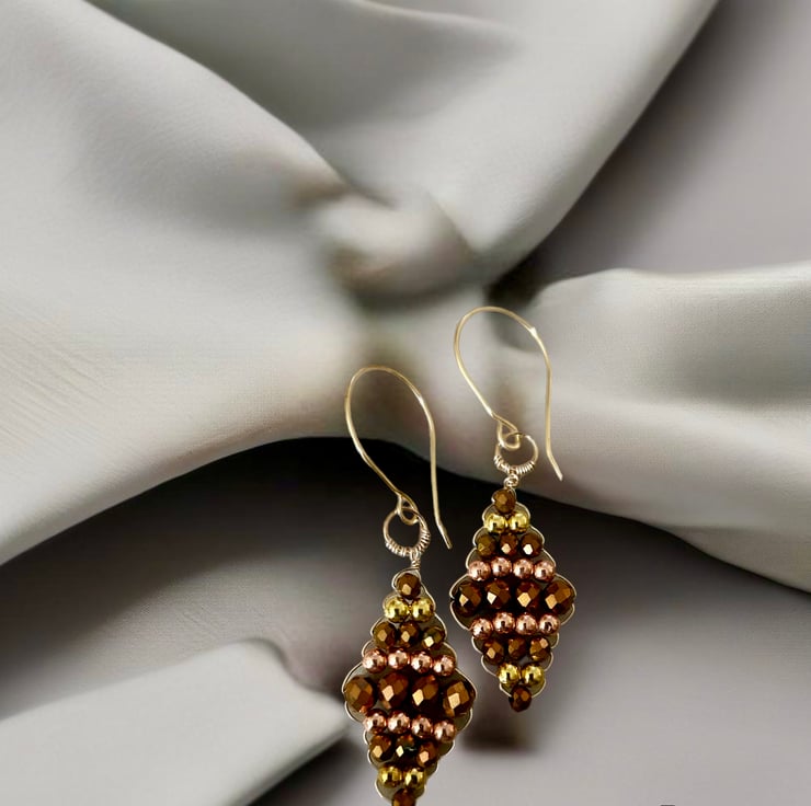 These beautiful earrings are made from super quality tarnish resistant Gold Plated jewellery wire featuring vibrant coloured faceted glass and gold/copper plated beads. Drop is approx 1”. Hook ear wire.