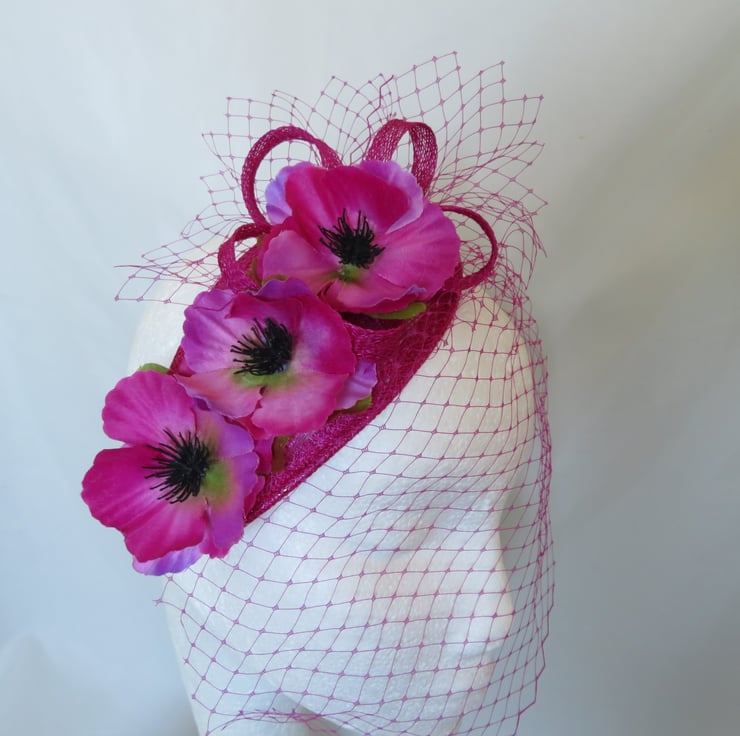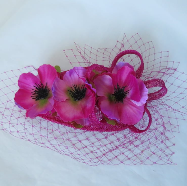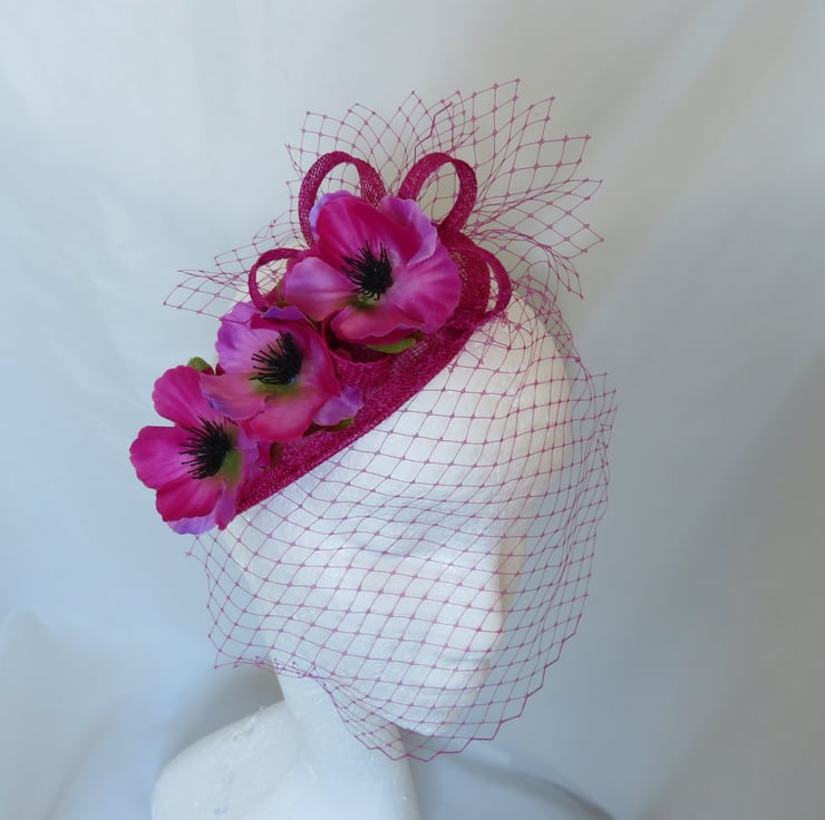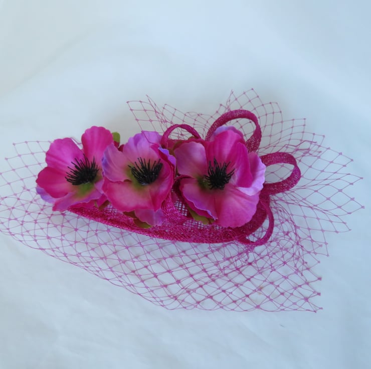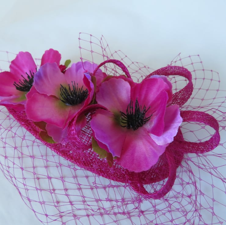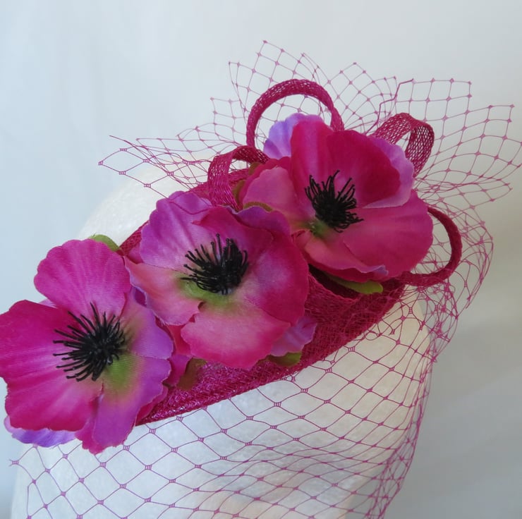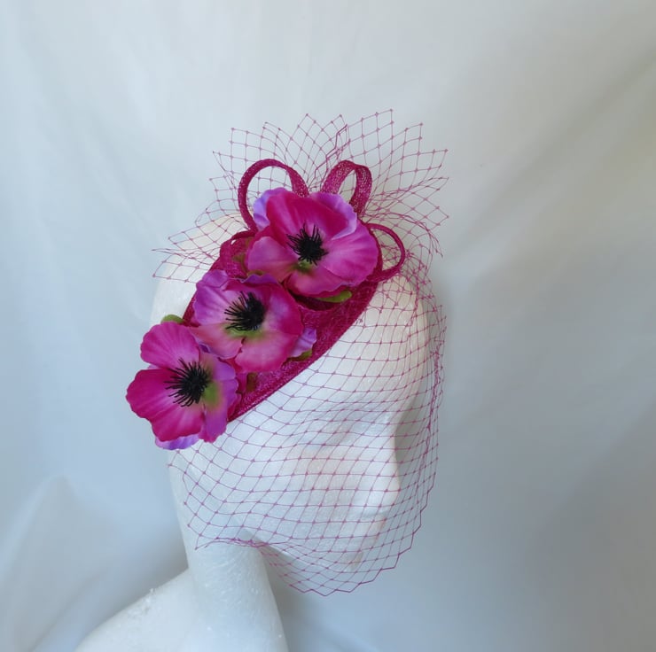 Decorated with a small asymmetrical matching magenta classic veil, which falls gently over the face at an angle, a small matching sinamay bias binding loopy bow and finished with three fabric Anemone flowers in shades of magenta, bright pink and a touch of violet with green leaves underneath.