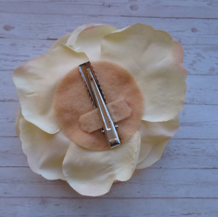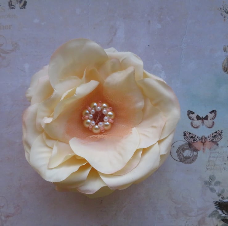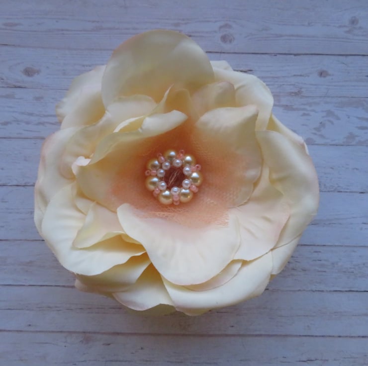This is a large and pretty hair flower accessory in pale creamy apricot.